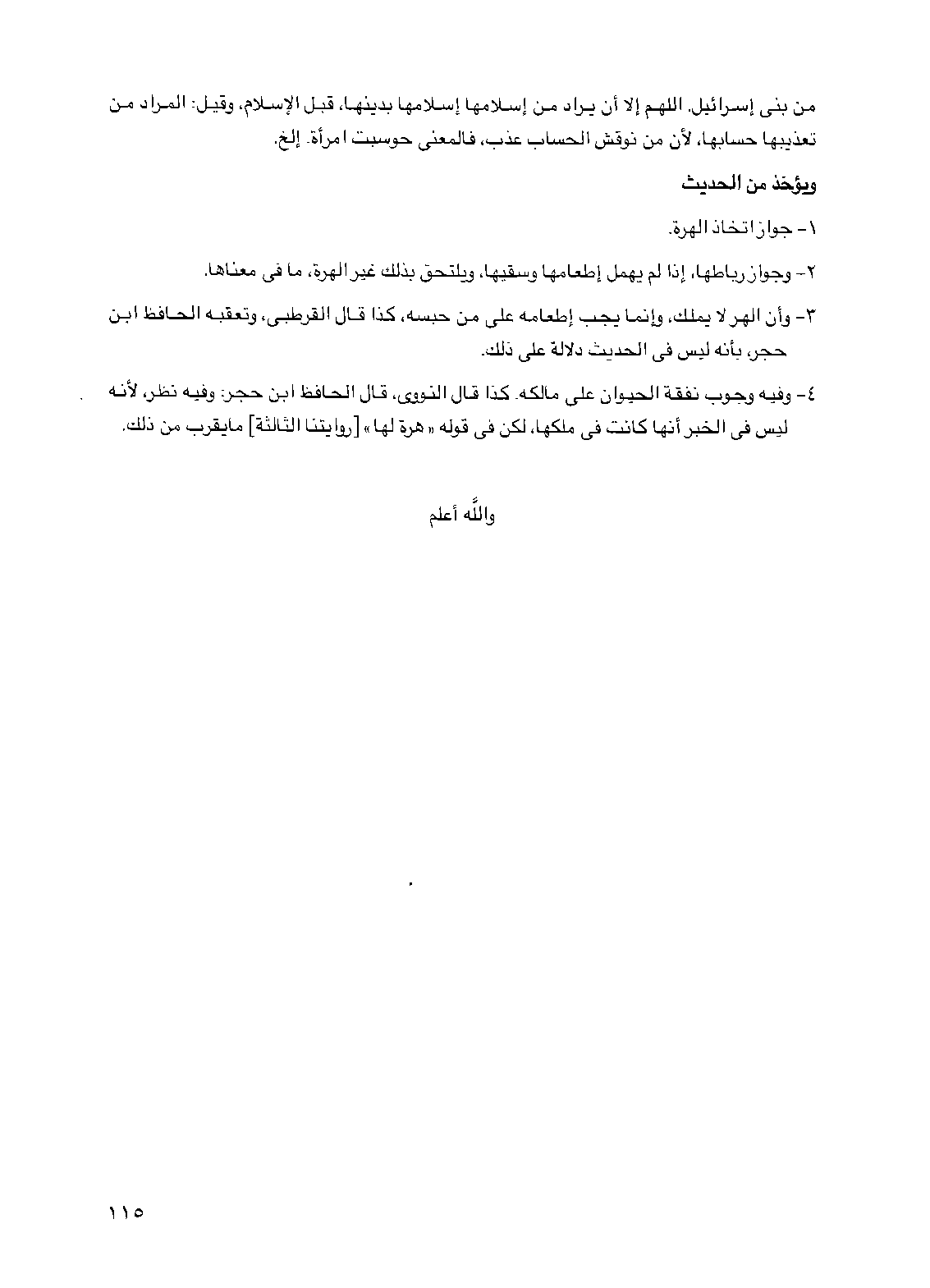 3 - وأن الهر لا يملك وإنما يجب إطعامه على من حبسه كذا قال القرطبي وتعقبه الحافظ ابن حجر بأنه ليس في الحديث دلالة على ذلك