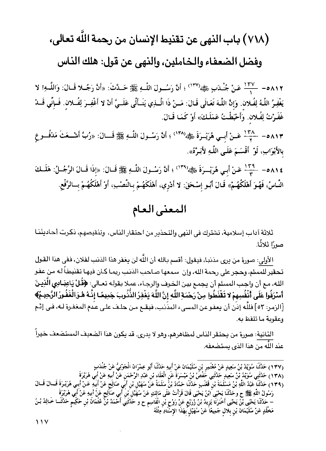 (718) باب النهي عن تقنيط الإنسان من رحمة الله تعالى وفضل الضعفاء والخاملين والنهي عن قول هلك الناس