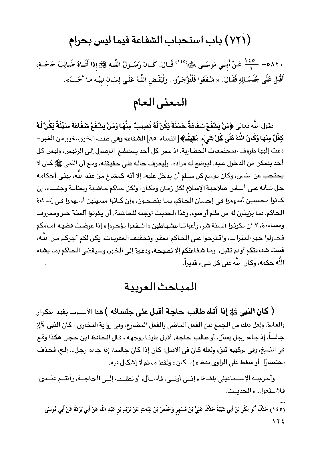 5820 - عن أبي موسى رضي الله عنه قال كان رسول الله صلى الله عليه وسلم إذا أتاه طالب حاجة أقبل على جلسائه فقال "اشفعوا فلتؤجروا وليقض الله على لسان نبيه ما أحب".
