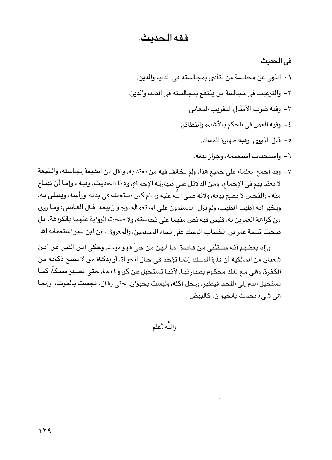 7 - وقد أجمع العلماء على جميع هذا ولم يخالف فيه من يعتد به ونقل عن الشيعة نجاسته والشيعة لا يعتد بهم في الإجماع ومن الدلائل على طهارته الإجماع وهذا الحديث وفيه "وإما أن تبتاع منه" والنجس لا يصح بيعه ولأنه صلى الله عليه وسلم كان يستعمله في بدنه ورأسه ويصلي به ويخبر أنه أطيب ولم يزل المسلمون على استعماله وجواز بيعه قال القاضي وما روي من كراهة العمرين له فليس فيه نص منهما على نجاسته ولا صحت الرواية عنهما بالكراهة بل صحت قسمة عمر بن الخطاب المسك على نساء المسلمين والمعروف عن ابن عمر استعماله اهـ