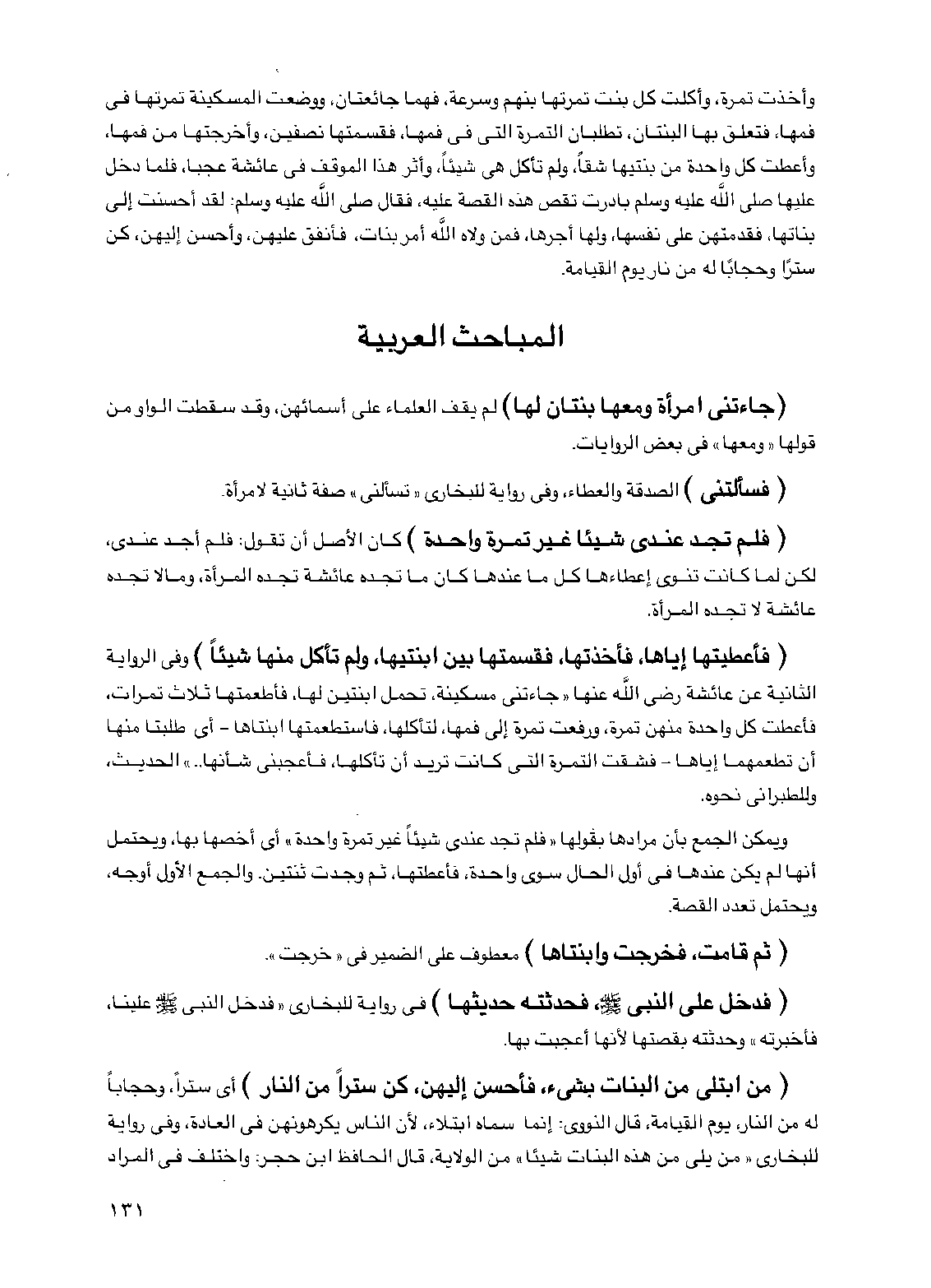 وأخذت تمرة وأكلت كل بنت تمرتها بنهم وسرعة فهما جائعتان ووضعت المسكينة تمرتها في فمها فتعلق بها البنتان تطلبان التمرة التي في فمها فقسمتها نصفين وأخرجتها من فمها وأعطت كل واحدة من بنتيها شقا ولم تأكل هي شيئا وأثر هذا الموقف في عائشة عجبا فلما دخل عليها صلى الله عليه وسلم بادرت تقص هذه القصة عليه فقال صلى الله عليه وسلم لقد أحسنت إلى بناتها فقدمتهن على نفسها ولها أجرها فمن ولاه الله أمر بنات فأنفق عليهن وأحسن إليهن كن سترا وحجابا له من نار يوم القيامة