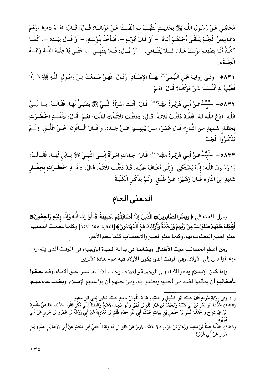 5832 - عن أبي هريرة رضي الله عنه قال أتت امرأة النبي صلى الله عليه وسلم بصبي لها فقالت يا نبي الله ادع الله له فلقد دفنت ثلاثة قال "دفنت ثلاثة" قالت نعم قال "لقد احتظرت بحظار شديد من النار" قال عمر من بينهم عن جده وقال الباقون عن طلق ولم يذكروا الجد.