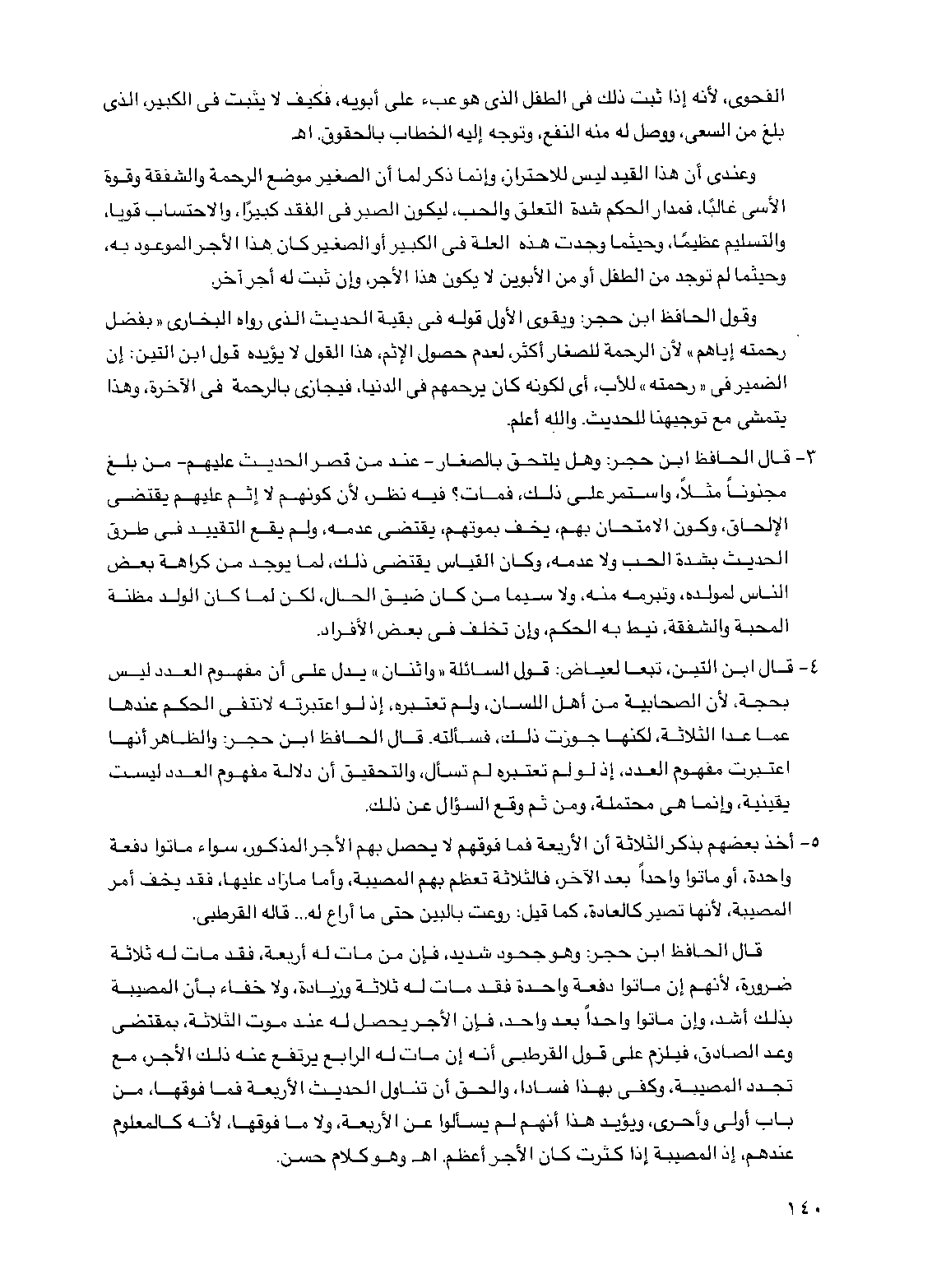 5 - أخذ بعضهم بذكر الثلاثة أن الأربعة فما فوقهم لا يحصل بهم الأجر المذكور سواء ماتوا دفعة واحدة أو ماتوا واحدا بعد الآخر فالثلاثة تعظم بهم المصيبة وأما ما زاد عليها فقد يخف أمر المصيبة لأنها تصير كالعادة كما قيل روعت بالبين حتى ما أراع له قاله القرطبي