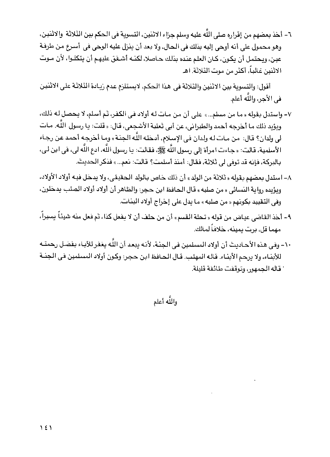 8 - استدل بعضهم بقوله "ثلاثة من الولد" أن ذلك خاص بالولد الحقيقي ولا يدخل فيه أولاد الأولاد ويؤيده رواية النسائي "من صلبه" قال الحافظ ابن حجر والظاهر أن أولاد أولاد الصلب يدخلون وفي التقييد بكونهم "من صلبه" ما يدل على إخراج أولاد البنات