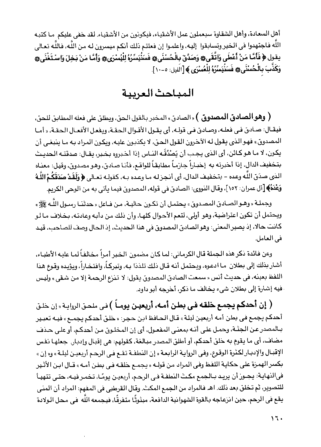 (إن أحدكم يجمع خلقه في بطن أمه أربعين يوما) في ملحق الرواية "إن خلق أحدكم يجمع في بطن أمه أربعين ليلة" قال الحافظ ابن حجر "خلق أحدكم يجمع" فيه تعبير بالمصدر عن الجثة وحمل على أنه بمعنى المفعول أي إن المخلوق من أحدكم أو على حذف مضاف أي ما يقوم به خلق أحدكم أو أطلق المصدر مبالغة كقولهم هي إقبال وإدبار جعلها نفس الإقبال والإدبار لكثرة الوقوع وفي الرواية الرابعة "إن النطفة تقع في الرحم أربعين ليلة" و"إن" بكسر الهمزة على حكاية اللفظ وفي المراد من قوله "يجمع خلقه في بطن أمه" قال ابن الأثير في النهاية يجوز أن يريد بالجمع مكث النطفة في الرحم أربعين يوما تخمر فيه حتى تتهيأ للتصوير ثم تخلق بعد ذلك اهـ فالمراد من الجمع المكث وقال القرطبي في المفهم المراد أن المني يقع في الرحم حين انزعاجه بالقوة الشهوانية الدافعة مبثوثا متفرقا فيجمعه الله في محل الولادة