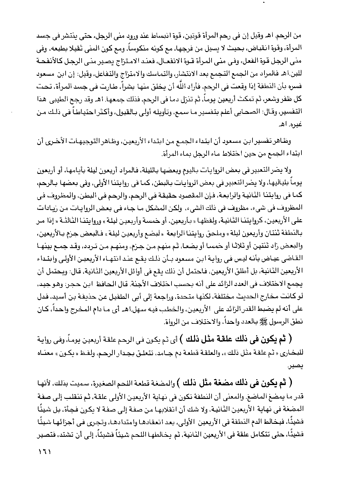 ولا يضر التعبير في بعض الروايات باليوم وبعضها بالليلة فالمراد أربعون ليلة بأيامها أو أربعون يوم بلياليها ولا يضر التعبير في بعض الروايات بالبطن كما في روايتنا الأولى وفي بعضها بالرحم كما في روايتنا الثانية والرابعة فإن المقصود حقيقة في الرحم والرحم في البطن والمظروف في المظروف في شيء مظروف في ذلك الشيء ولكن المشكل ما جاء في بعض الروايات من زيادات على الأربعين كروايتنا الثانية ولفظها "بأربعين أو خمسة وأربعين ليلة" وروايتنا الثالثة "إذا مر بالنطفة ثنتان وأربعون ليلة" وملحق روايتنا الرابعة "لبضع وأربعين ليلة" فالبعض جزم بالأربعين والبعض زاد ثنتين أو ثلاثا أو خمسا أو بضعا ثم منهم من جزم ومنهم من تردد وقد جمع بينها القاضي عياض بأنه ليس في رواية ابن مسعود بأن ذلك يقع عند انتهاء الأربعين الأولى وابتداء الأربعين الثانية بل أطلق الأربعين فاحتمل أن ذلك يقع في أوائل الأربعين الثانية قال ويحتمل أن يجمع الاختلاف في العدد الزائد على أنه بحسب اختلاف الأجنة قال الحافظ ابن حجر وهو جيد لو كانت مخارج الحديث مختلفة لكنها متحدة وراجعة إلى أبي الطفيل عن حذيفة بن أسيد فدل على أنه لم يضبط القدر الزائد على الأربعين والخطب فيه سهل اهـ أي مادام المخرج واحدا كان نطق الرسول صلى الله عليه وسلم بالعدد واحدا والاختلاف من الرواة