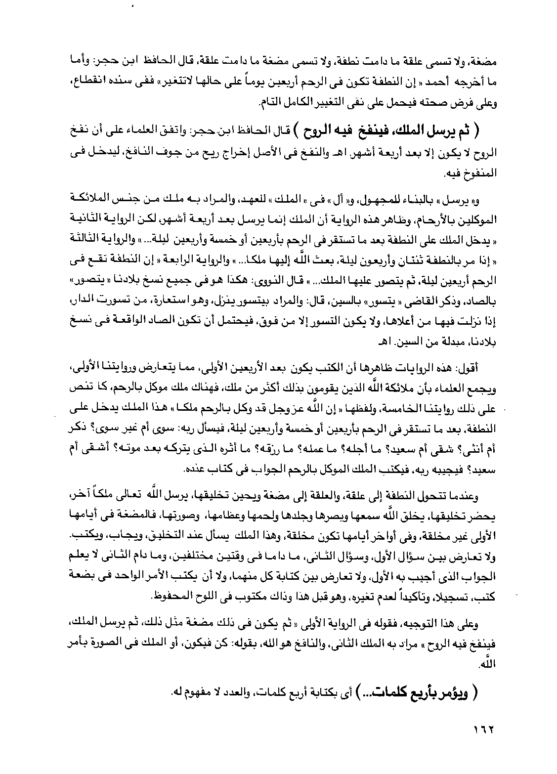 أقول هذه الروايات ظاهرها أن الكتب يكون بعد الأربعين الأولى مما يتعارض وروايتنا الأولى ويجمع العلماء بأن ملائكة الله الذين يقومون بذلك أكثر من ملك فهناك ملك موكل بالرحم كما تنص على ذلك روايتنا الخامسة ولفظها "إن الله عز وجل قد وكل بالرحم ملكا" هذا الملك يدخل على النطفة بعد ما تستقر في الرحم بأربعين أو خمسة وأربعين ليلة فيسأل ربه سوي أم غير سوي ذكر أم أنثى شقي أم سعيد ما أجله ما عمله ما رزقه ما أثره الذي يتركه بعد موته أشقي أم سعيد فيجيبه ربه فيكتب الملك الموكل بالرحم الجواب في كتاب عنده
