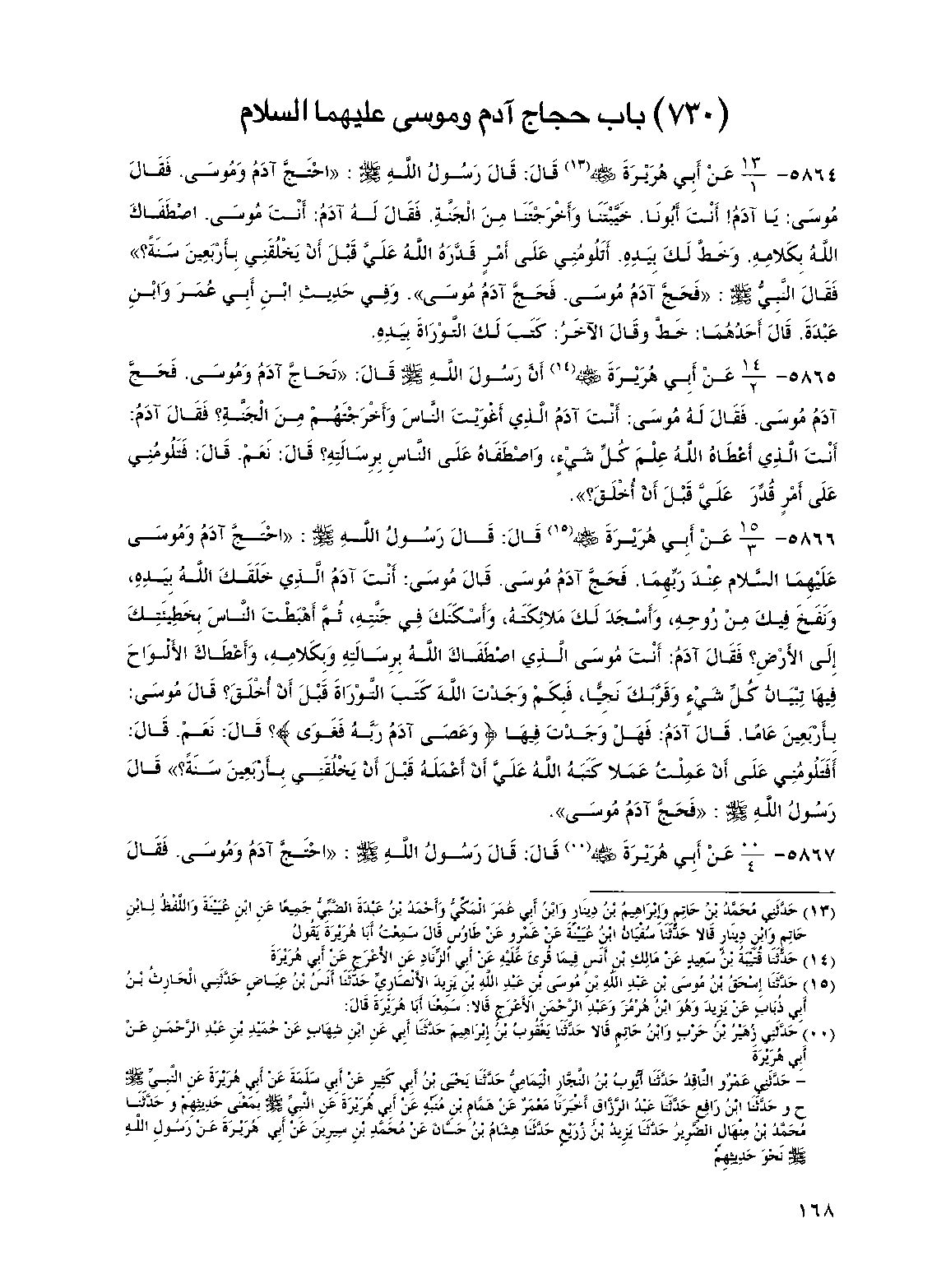 5865 - عن أبي هريرة رضي الله عنه أن رسول الله صلى الله عليه وسلم قال "تحاج آدم وموسى فحج آدم موسى فقال له موسى أنت آدم الذي أغويت الناس وأخرجتهم من الجنة فقال آدم أنت الذي أعطاه الله علم كل شيء واصطفاه على الناس برسالته قال نعم قال فتلومني على أمر قدر علي قبل أن أخلق".