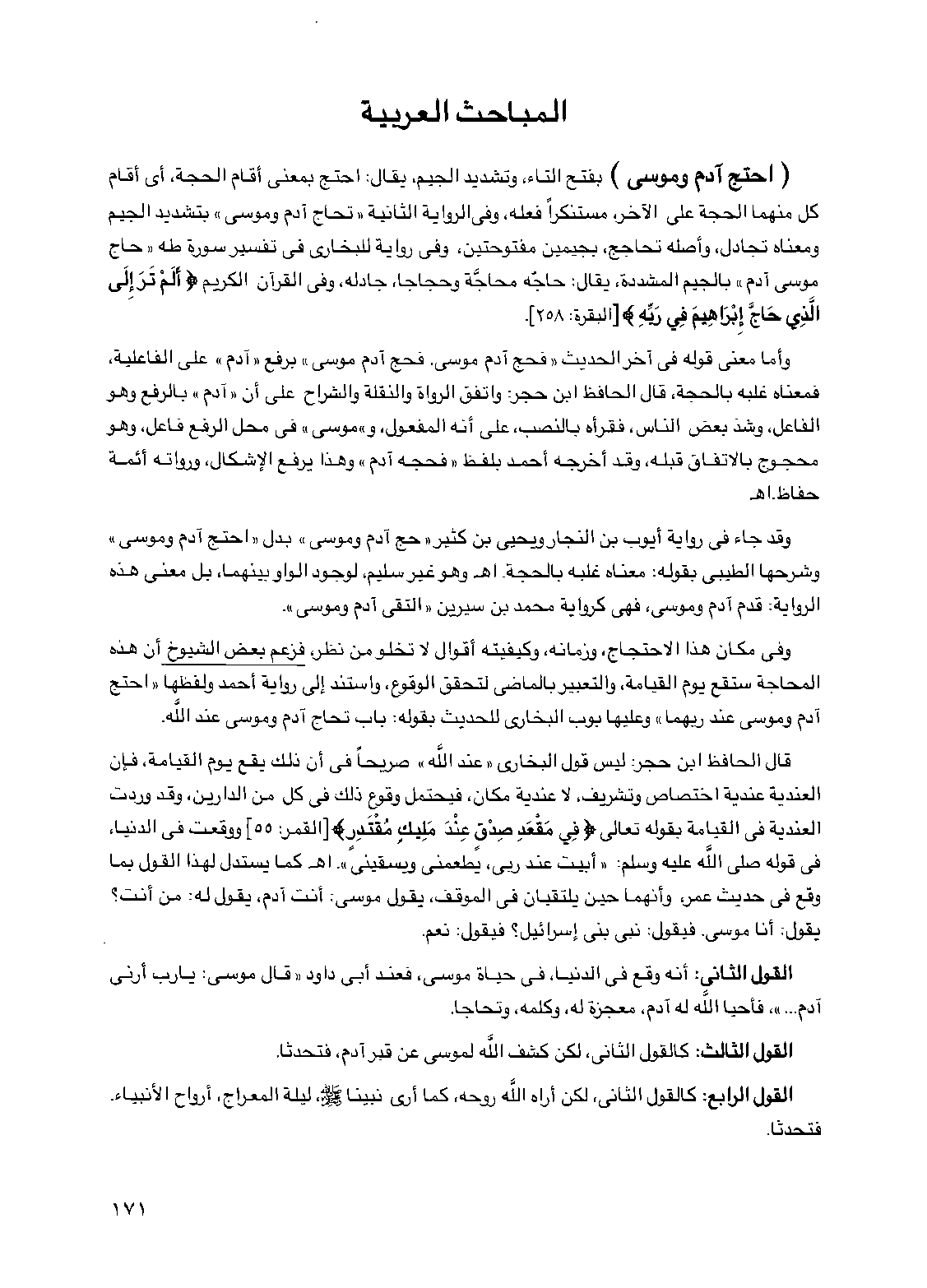 وقد جاء في رواية أيوب بن النجار ويحيى بن كثير "حج آدم وموسى" بدل "احتج آدم وموسى" وشرحها الطيبي بقوله معناه غلبه بالحجة اهـ وهو غير سليم لوجود الواو بينهما بل معنى هذه الرواية قدم آدم وموسى فهي كرواية محمد بن سيرين "التقى آدم وموسى"