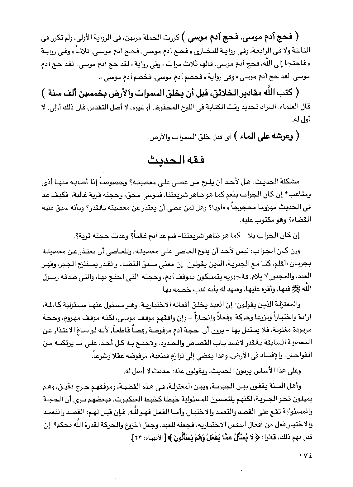 وإن كان الجواب ليس لأحد أن يلوم العاصي على معصيته وللعاصي أن يعتذر عن معصيته بجريان القلم كنا مع الجبرية الذين يقولون إن معنى سبق القضاء والقدر يستلزم الجبر وقهر العبد والمجبور لا يلام فالجبرية يتمسكون بموقف آدم وحجته التي احتج بها والتي صدقه رسول الله صلى الله عليه وسلم فيها وأقره عليها وشهد له بأنه غلب خصمه بها