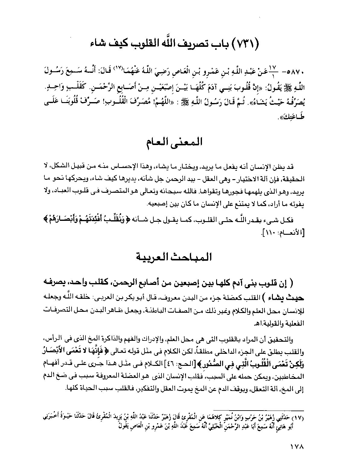 (إن قلوب بني آدم كلها بين إصبعين من أصابع الرحمن كقلب واحد يصرفه حيث يشاء) القلب كعضلة جزء من البدن معروف قال أبو بكر بن العربي خلقه الله وجعله للإنسان محل العلم والكلام وغير ذلك من الصفات الباطنة وجعل ظاهر البدن محل التصرفات الفعلية والقولية اهـ والتحقيق أن المراد بالقلوب التي هي محل العلم والإدراك والفهم والذاكرة المخ الذي في الرأس والقلب يطلق على الجزء الداخلي مطلقا لكن الكلام في مثل قوله تعالى {فإنها لا تعمى الأبصار ولكن تعمى القلوب التي في الصدور} [الحج 46] الكلام في مثل هذا جرى على قدر أفهام المخاطبين ويمكن حمله على السبب فقلب الإنسان الذي هو العضلة المعروفة سبب في ضخ الدم إلى المخ آلة التعقل وبوقف الدم عن المخ يموت العقل والتفكير فالقلب سبب الحياة كلها