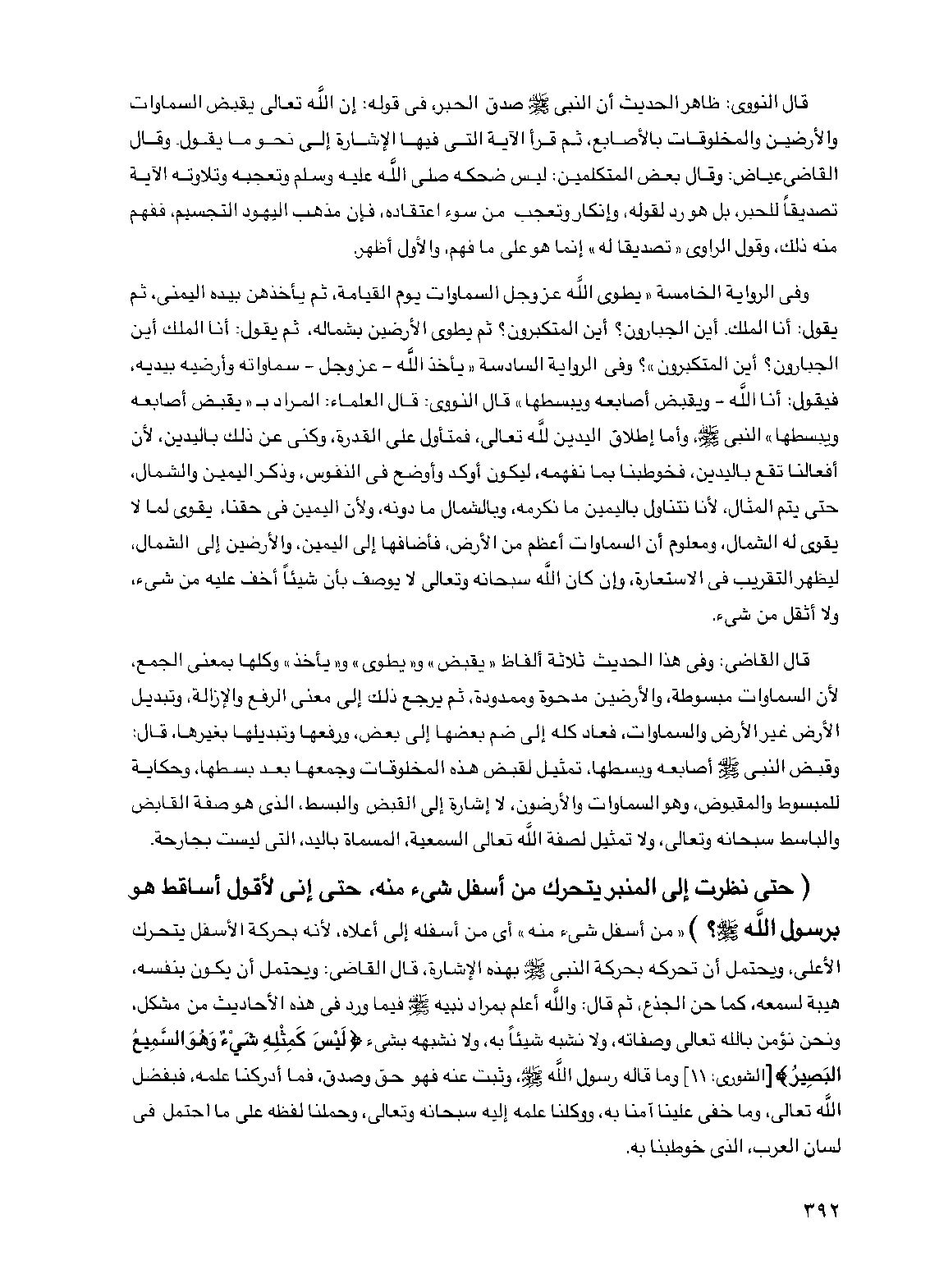قال القاضي وفي هذا الحديث ثلاثة ألفاظ "يقبض" و"يطوي" و"يأخذ" وكلها بمعنى الجمع لأن السماوات مبسوطة والأرضين مدحوة وممدودة ثم يرجع ذلك إلى معنى الرفع والإزالة وتبديل الأرض غير الأرض والسماوات فعاد كله إلى ضم بعضها إلى بعض ورفعها وتبديلها بغيرها قال وقبض النبي صلى الله عليه وسلم أصابعه وبسطها تمثيل لقبض هذه المخلوقات وجمعها بعد بسطها وحكاية للمبسوط والمقبوض وهو السماوات والأرضون لا إشارة إلى القبض والبسط الذي هو صفة القابض والباسط سبحانه وتعالى ولا تمثيل لصفة الله تعالى السمعية المسماة باليد التي ليست بجارحة