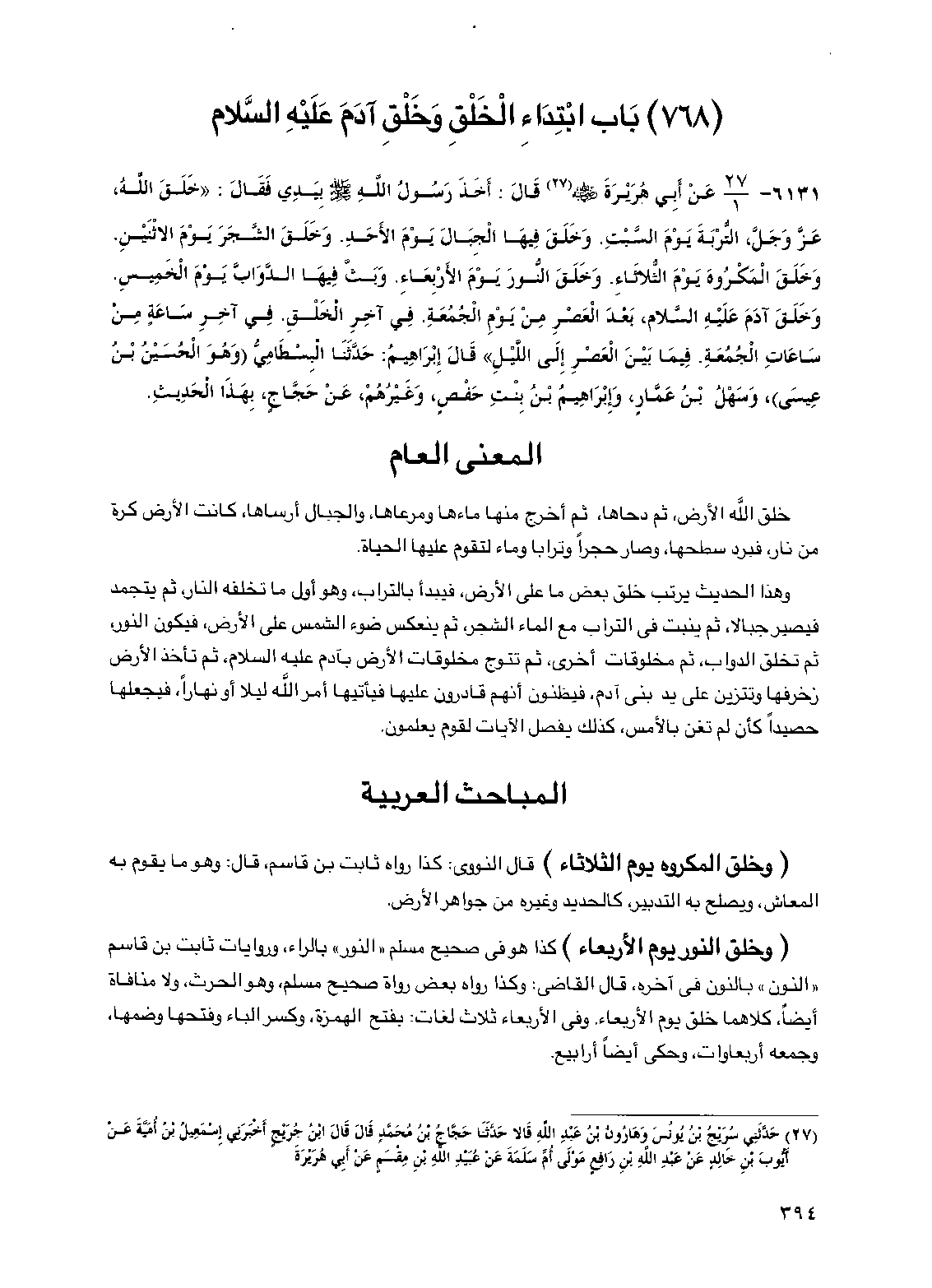6131 - عن أبي هريرة رضي الله عنه قال أخذ رسول الله صلى الله عليه وسلم بيدي فقال "خلق الله عز وجل التربة يوم السبت وخلق فيها الجبال يوم الأحد وخلق الشجر يوم الإثنين وخلق المكروه يوم الثلاثاء وخلق النور يوم الأربعاء وبث فيها الدواب يوم الخميس وخلق آدم عليه السلام بعد العصر من يوم الجمعة في آخر الخلق في آخر ساعة من ساعات الجمعة فيما بين العصر إلى الليل" قال إبراهيم حدثنا البسطامي (وهو الحسين بن عيسى) وسهل بن عمار وإبراهيم ابن بنت حفص وغيرهم عن حجاج بهذا الحديث.