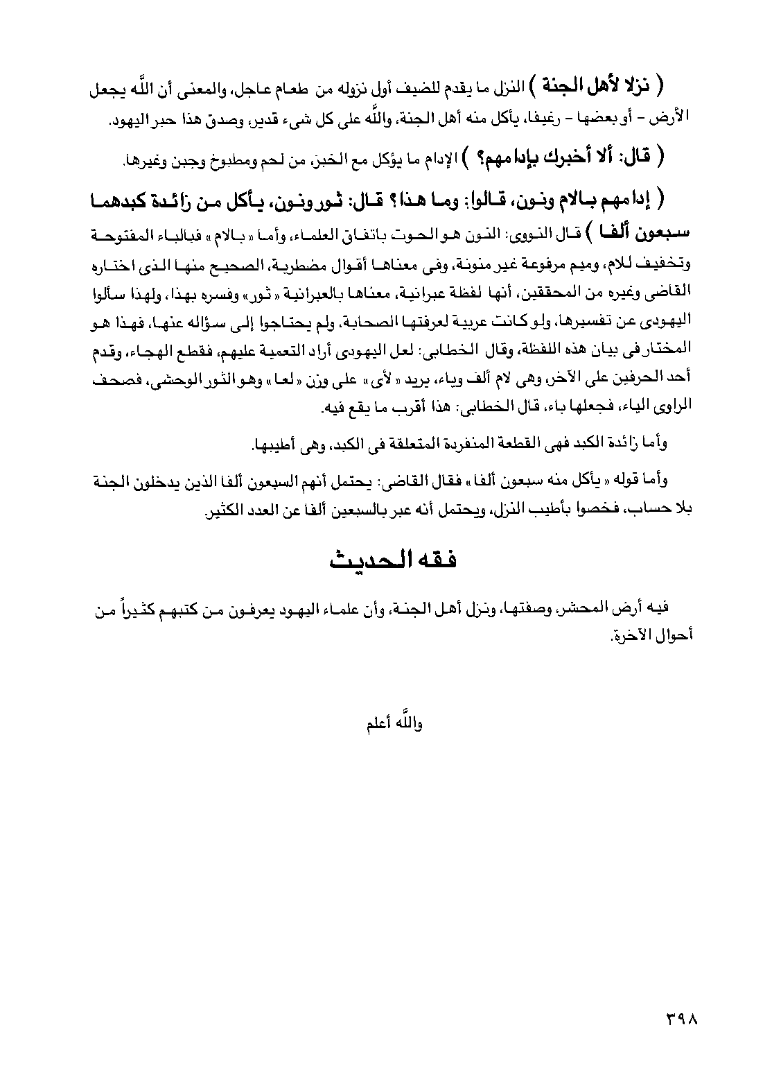 (إدامهم بالام ونون قالوا وما هذا قال ثور ونون يأكل من زائدة كبدهما سبعون ألفا) قال النووي النون هو الحوت باتفاق العلماء وأما "بالام" فبالباء المفتوحة وتخفيف للام وميم مرفوعة غير منونة وفي معناها أقوال مضطربة الصحيح منها الذي اختاره القاضي وغيره من المحققين أنها لفظة عبرانية معناها بالعبرانية "ثور" وفسره بهذا ولهذا سألوا اليهودي عن تفسيرها ولو كانت عربية لعرفتها الصحابة ولم يحتاجوا إلى سؤاله عنها فهذا هو المختار في بيان هذه اللفظة وقال الخطابي لعل اليهودي أراد التعمية عليهم فقطع الهجاء وقدم أحد الحرفين على الآخر وهي لام ألف وياء يريد "لأي" على وزن "لعا" وهو الثور الوحشي فصحف الراوي الياء فجعلها باء قال الخطابي هذا أقرب ما يقع فيه