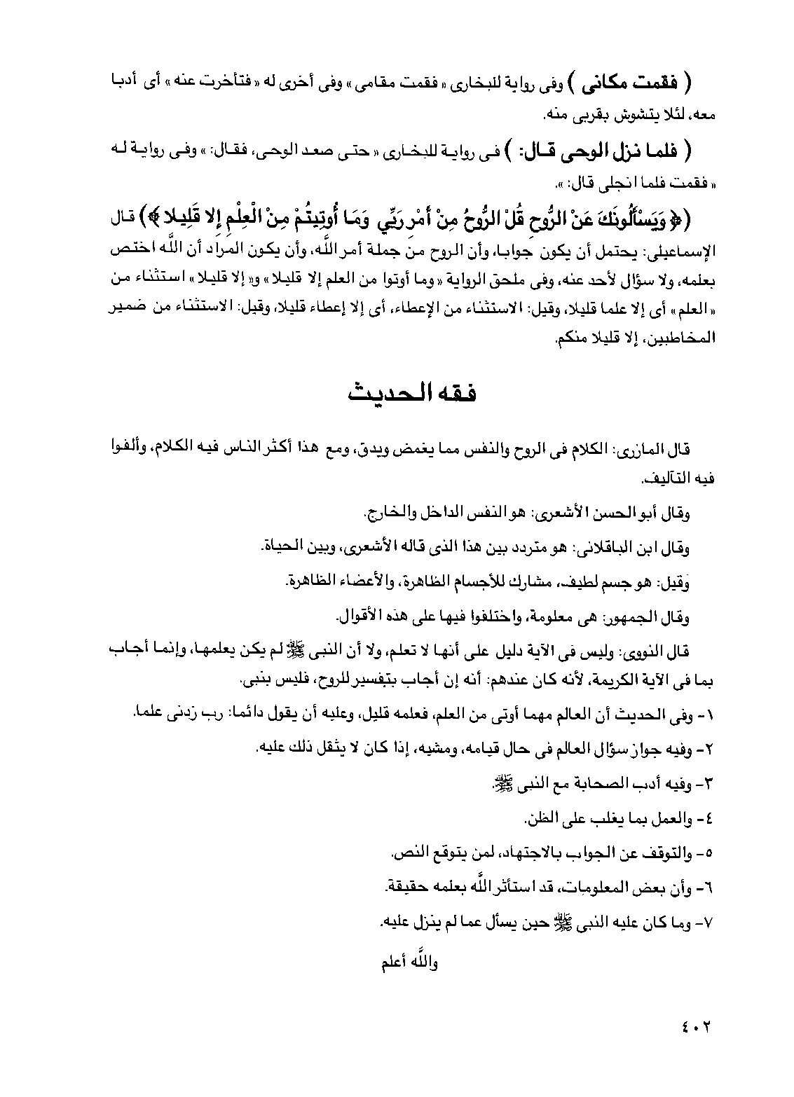 {ويسألونك عن الروح قل الروح من أمر ربي وما أوتيتم من العلم إلا قليلا} قال الإسماعيلي يحتمل أن يكون جوابا وأن الروح من جملة أمر الله وأن يكون المراد أن الله اختص بعلمه ولا سؤال لأحد عنه وفي ملحق الرواية "وما أوتوا من العلم إلا قليلا" و"إلا قليلا" استثناء من "العلم" أي إلا علما قليلا وقيل الاستثناء من الإعطاء أي إلا إعطاء قليلا وقيل الاستثناء من ضمير المخاطبين إلا قليلا منكم