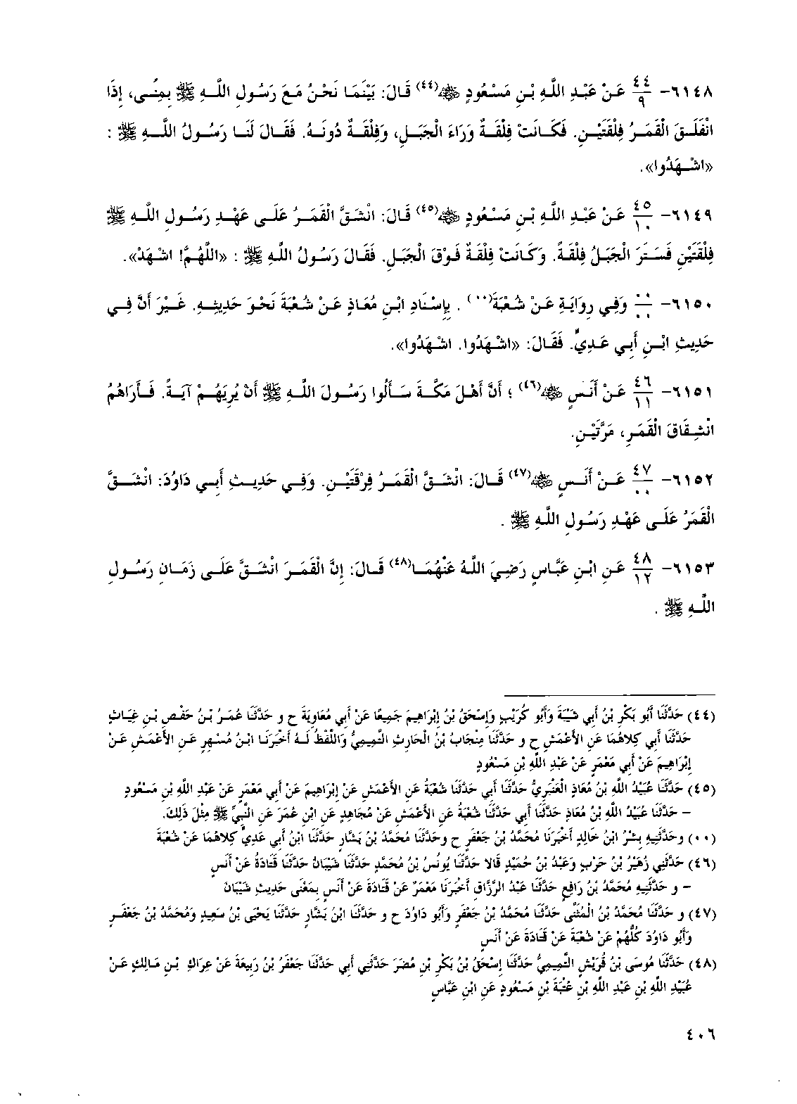 6149 - عن عبد الله بن مسعود رضي الله عنه قال انشق القمر على عهد رسول الله صلى الله عليه وسلم فلقتين فستر الجبل فلقة وكانت فلقة فوق الجبل فقال رسول الله صلى الله عليه وسلم "اللهم اشهد".