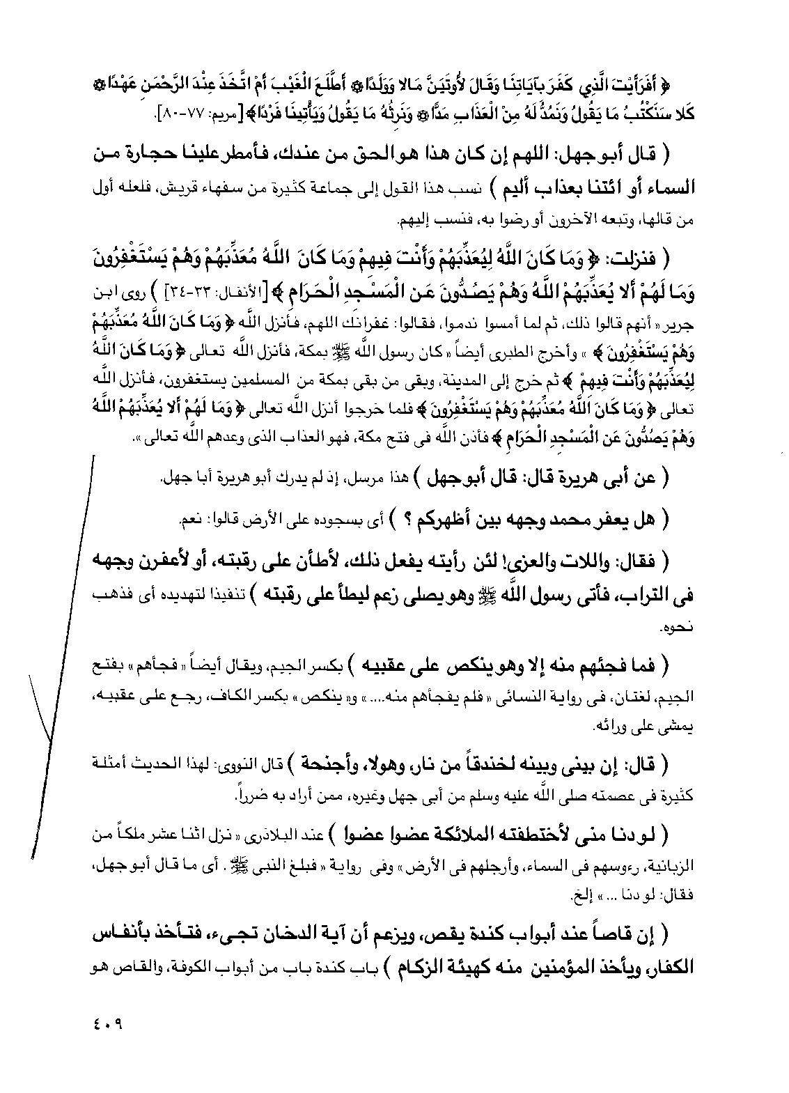 (لو دنا مني لأختطفته الملائكة عضوا عضوا) عند البلاذري "نزل اثنا عشر ملكا من الزبانية رءوسهم في السماء وأرجلهم في الأرض" وفي رواية "فبلغ النبي صلى الله عليه وسلم أي ما قال أبو جهل فقال لو دنا .... " إلخ