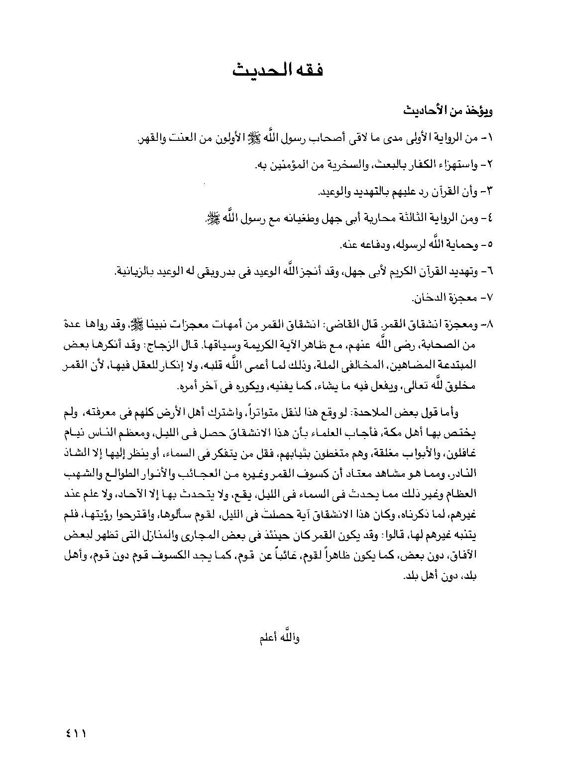 8 - ومعجزة انشقاق القمر قال القاضي انشقاق القمر من أمهات معجزات نبينا صلى الله عليه وسلم وقد رواها عدة من الصحابة رضي الله عنهم مع ظاهر الآية الكريمة وسياقها قال الزجاج وقد أنكرها بعض المبتدعة المضاهين المخالفي الملة وذلك لما أعمى الله قلبه ولا إنكار للعقل فيها لأن القمر مخلوق لله تعالى ويفعل فيه ما يشاء كما يفنيه ويكوره في آخر أمره