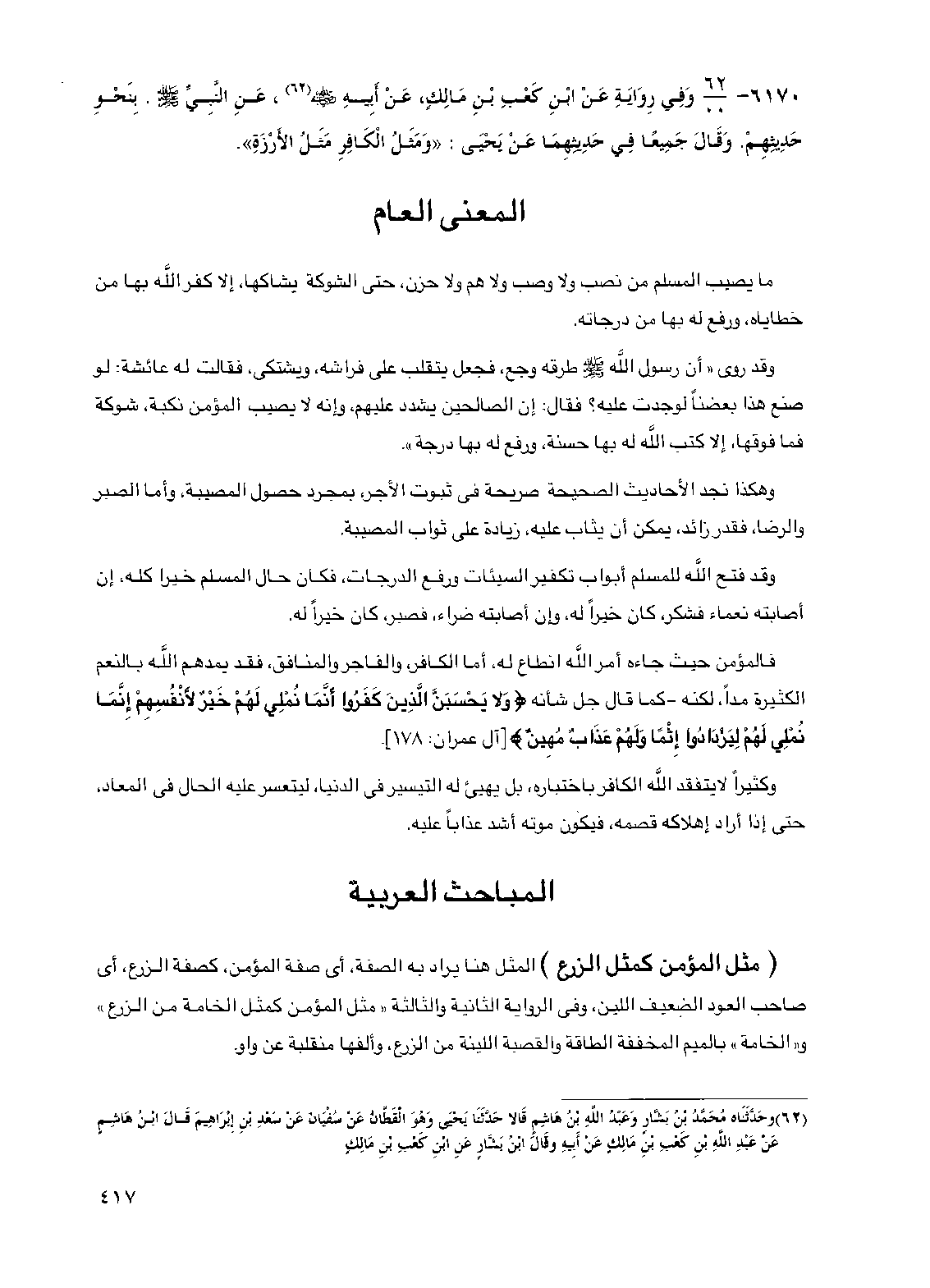 (مثل المؤمن كمثل الزرع) المثل هنا يراد به الصفة أي صفة المؤمن كصفة الزرع أي صاحب العود الضعيف اللين وفي الرواية الثانية والثالثة "مثل المؤمن كمثل الخامة من الزرع" و"الخامة" بالميم المخففة الطاقة والقصبة اللينة من الزرع وألفها منقلبة عن واو