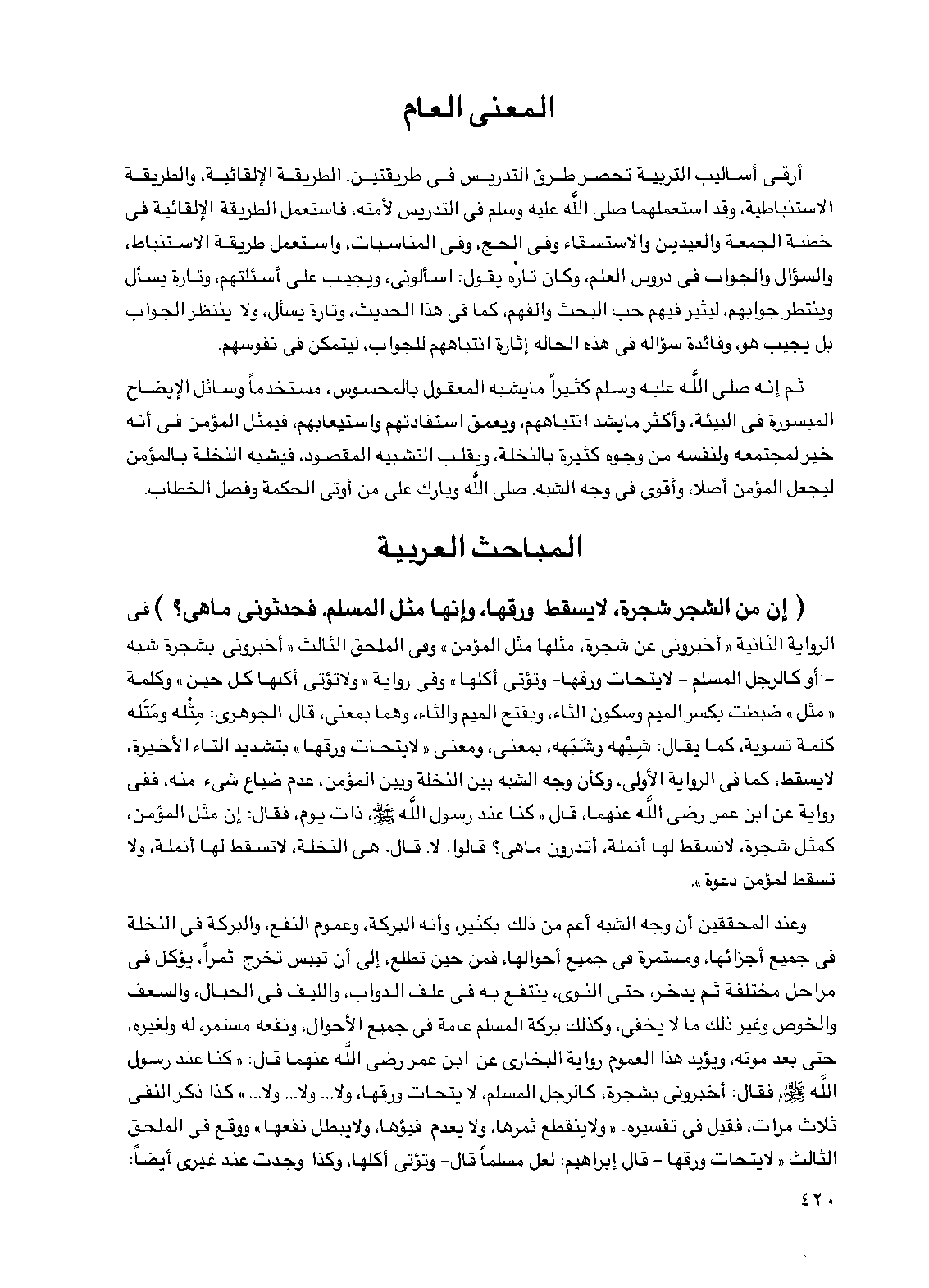 (إن من الشجر شجرة لا يسقط ورقها وإنها مثل المسلم فحدثوني ما هي) في الرواية الثانية "أخبروني عن شجرة مثلها مثل المؤمن" وفي الملحق الثالث "أخبروني بشجرة شبه أو كالرجل المسلم لا يتحات ورقها وتؤتي أكلها" وفي رواية "ولا تؤتي أكلها كل حين" وكلمة "مثل" ضبطت بكسر الميم وسكون الثاء وبفتح الميم والثاء وهما بمعنى قال الجوهري مثله ومثله كلمة تسوية كما يقال شبهه وشبهه بمعنى ومعنى "لا يتحات ورقها" بتشديد التاء الأخيرة لا يسقط كما فى الرواية الأولى وكأن وجه الشبه بين النخلة وبين المؤمن عدم ضياع شيء منه ففي رواية عن ابن عمر رضي الله عنهما قال "كنا عند رسول الله صلى الله عليه وسلم ذات يوم فقال إن مثل المؤمن كمثل شجرة لا تسقط لها أنملة أتدرون ما هي قالوا لا قال هي النخلة لا تسقط لها أنملة ولا تسقط لمؤمن دعوة"