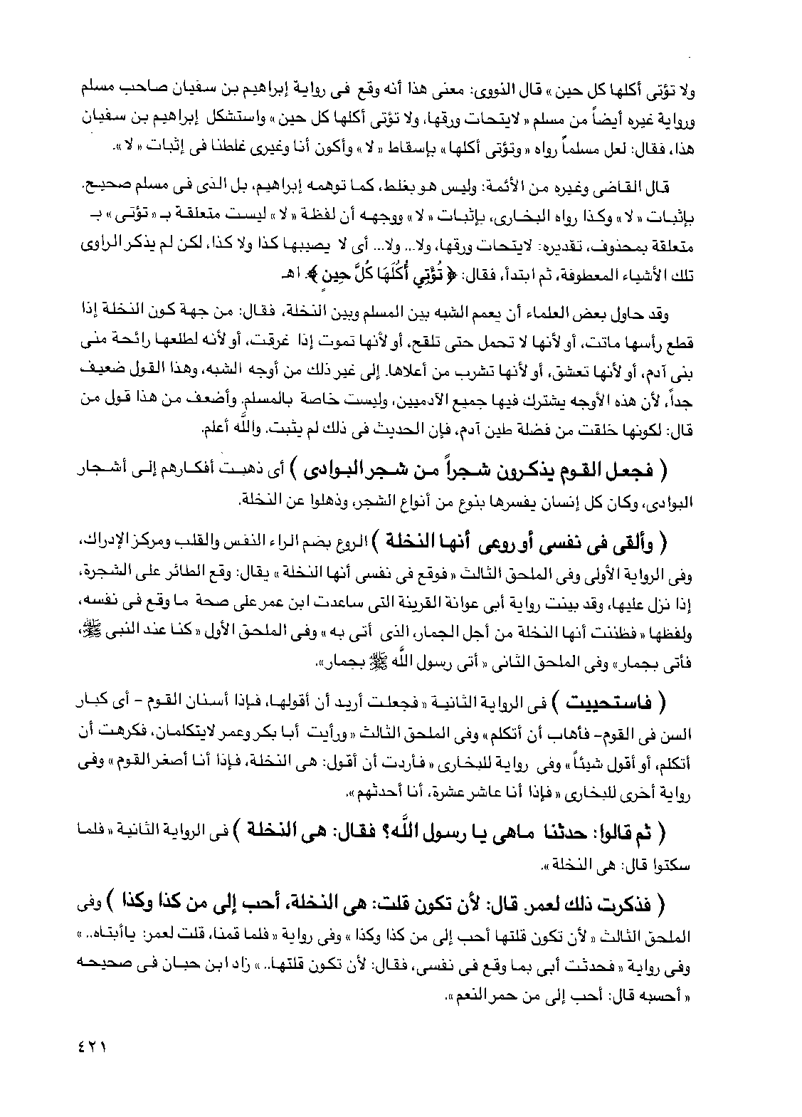 قال القاضي وغيره من الأئمة وليس هو بغلط كما توهمه إبراهيم بل الذي في مسلم صحيح بإثبات "لا" وكذا رواه البخاري بإثبات "لا" ووجهه أن لفظة "لا" ليست متعلقة بـ "تؤتي" بـ متعلقة بمحذوف تقديره لا يتحات ورقها ولا ... ولا ... أي لا يصيبها كذا ولا كذا لكن لم يذكر الراوي تلك الأشياء المعطوفة ثم ابتدأ فقال {تؤتي أكلها كل حين} اهـ
