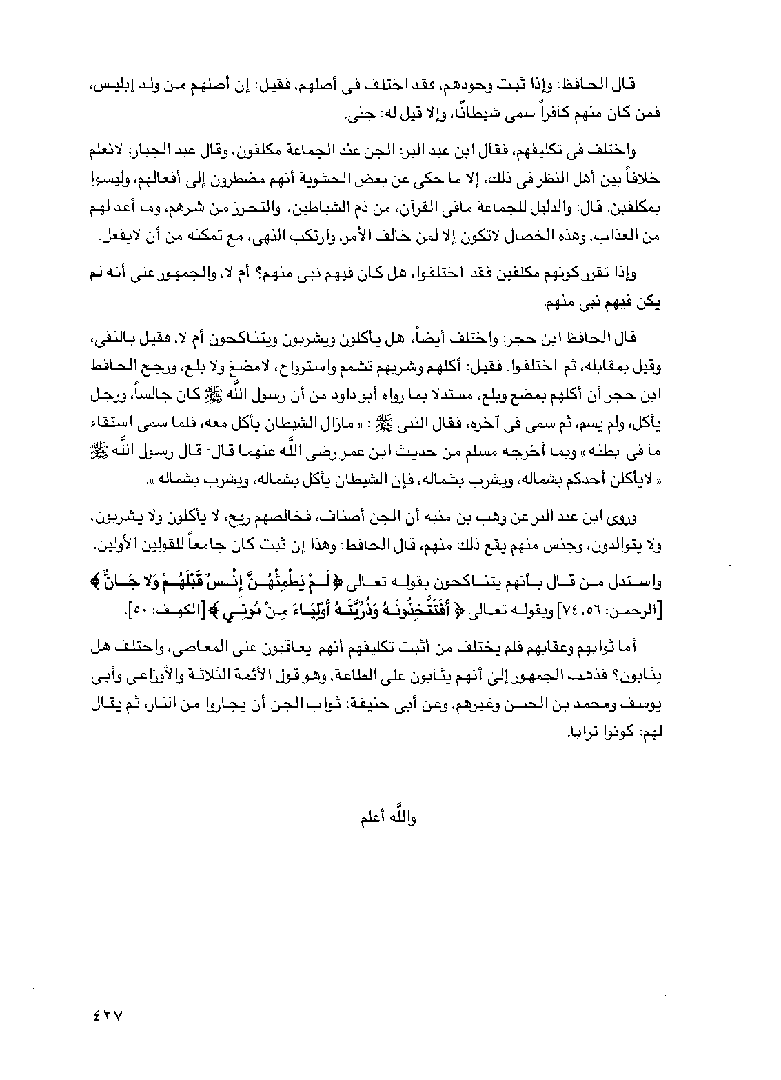 واختلف في تكليفهم فقال ابن عبد البر الجن عند الجماعة مكلفون وقال عبد الجبار لا نعلم خلافا بين أهل النظر في ذلك إلا ما حكي عن بعض الحشوية أنهم مضطرون إلى أفعالهم وليسوا بمكلفين قال والدليل للجماعة ما في القرآن من ذم الشياطين والتحرز من شرهم وما أعد لهم من العذاب وهذه الخصال لا تكون إلا لمن خالف الأمر وارتكب النهي مع تمكنه من أن لا يفعل
