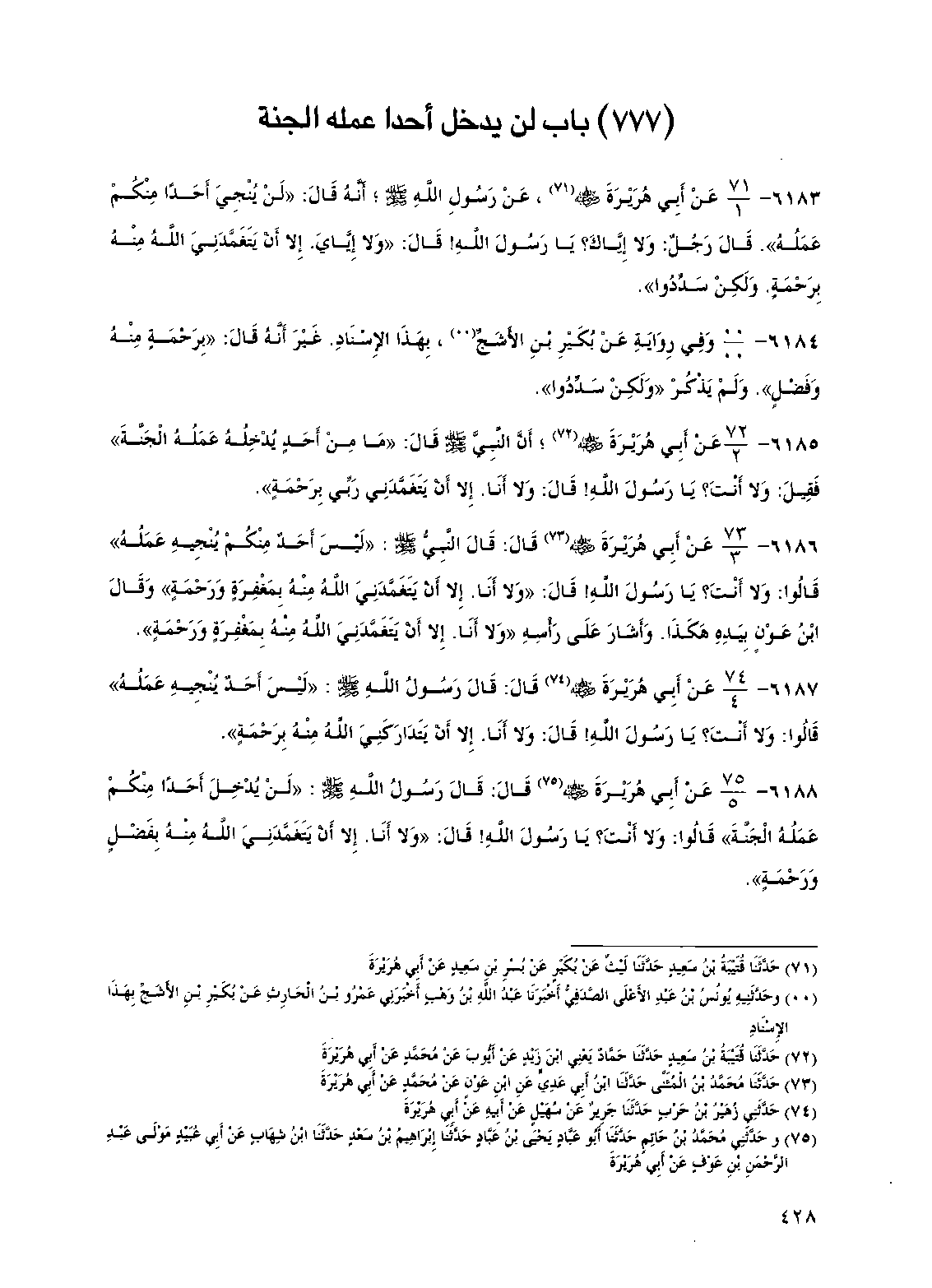 6188 - عن أبي هريرة رضي الله عنه قال قال رسول الله صلى الله عليه وسلم "لن يدخل أحدا منكم عمله الجنة" قالوا ولا أنت يا رسول الله قال "ولا أنا إلا أن يتغمدني الله منه بفضل ورحمة"