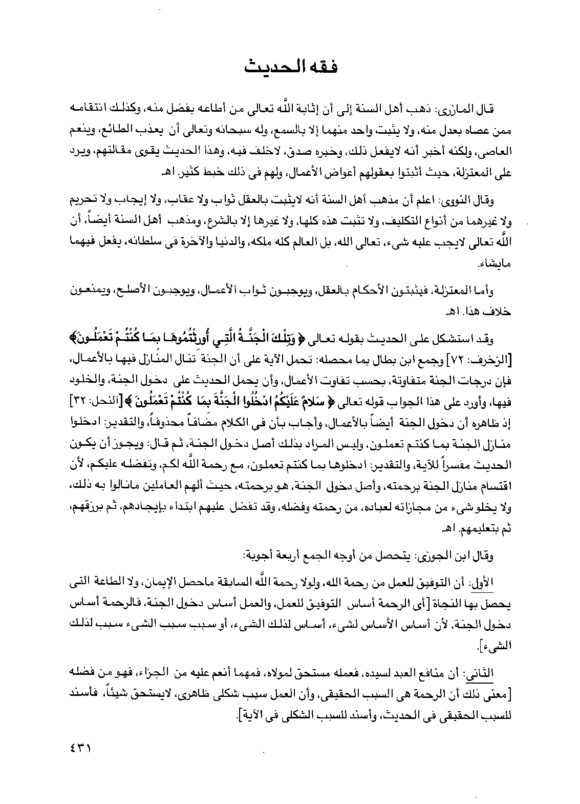 الأول أن التوفيق للعمل من رحمة الله ولولا رحمة الله السابقة ما حصل الإيمان ولا الطاعة التي يحصل بها النجاة [أي الرحمة أساس التوفيق للعمل والعمل أساس دخول الجنة فالرحمة أساس دخول الجنة لأن أساس الأساس لشيء أساس لذلك الشيء أو سبب سبب الشيء سبب لذلك الشيء]