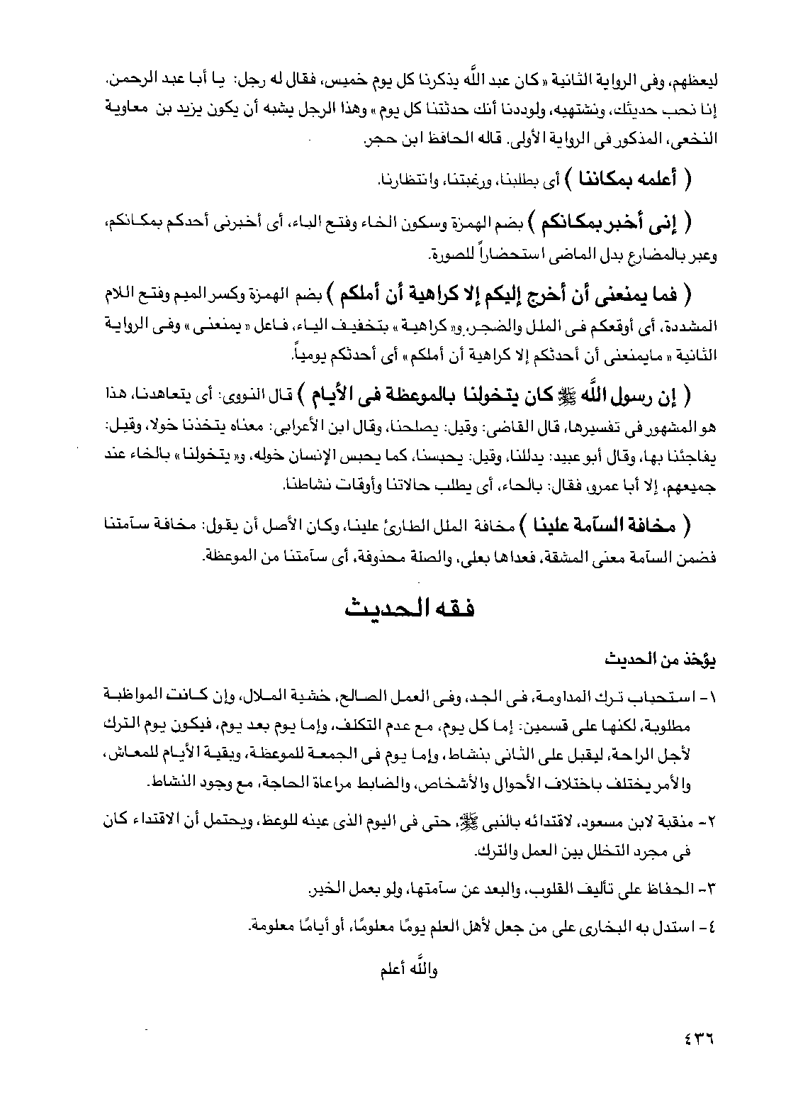 ليعظهم وفي الرواية الثانية "كان عبد الله يذكرنا كل يوم خميس فقال له رجل يا أبا عبد الرحمن إنا نحب حديثك ونشتهيه ولوددنا أنك حدثتنا كل يوم" وهذا الرجل يشبه أن يكون يزيد بن معاوية النخعي المذكور في الرواية الأولى قاله الحافظ ابن حجر