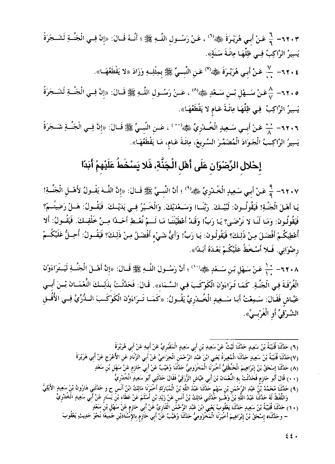 6208 - عن سهل بن سعد رضي الله عنه أن رسول الله صلى الله عليه وسلم قال "إن أهل الجنة ليتراءون الغرفة في الجنة كما تراءون الكوكب في السماء" قال فحدثت بذلك النعمان بن أبي عياش فقال سمعت أبا سعيد الخدري يقول "كما تراءون الكوكب الدري في الأفق الشرقي أو الغربي"