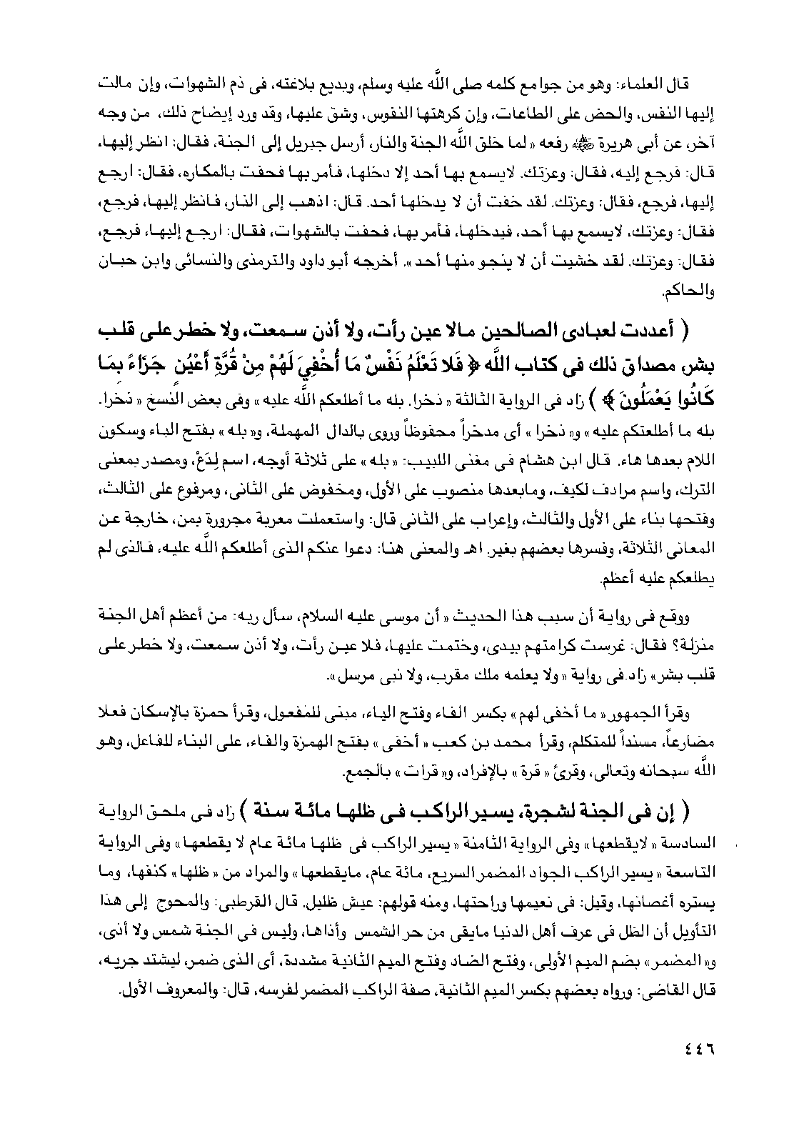 (إن في الجنة لشجرة يسير الراكب في ظلها مائة سنة) زاد في ملحق الرواية السادسة "لا يقطعها" وفي الرواية الثامنة "يسير الراكب في ظلها مائة عام لا يقطعها" وفي الرواية التاسعة "يسير الراكب الجواد المضمر السريع مائة عام ما يقطعها" والمراد من "ظلها" كنفها وما يستره أغصانها وقيل في نعيمها وراحتها ومنه قولهم عيش ظليل قال القرطبي والمحوج إلى هذا التأويل أن الظل في عرف أهل الدنيا ما يقي من حر الشمس وأذاها وليس في الجنة شمس ولا أذى و"المضمر" بضم الميم الأولى وفتح الضاد وفتح الميم الثانية مشددة أي الذي ضمر ليشتد جريه قال القاضي ورواه بعضهم بكسر الميم الثانية صفة الراكب المضمر لفرسه قال والمعروف الأول