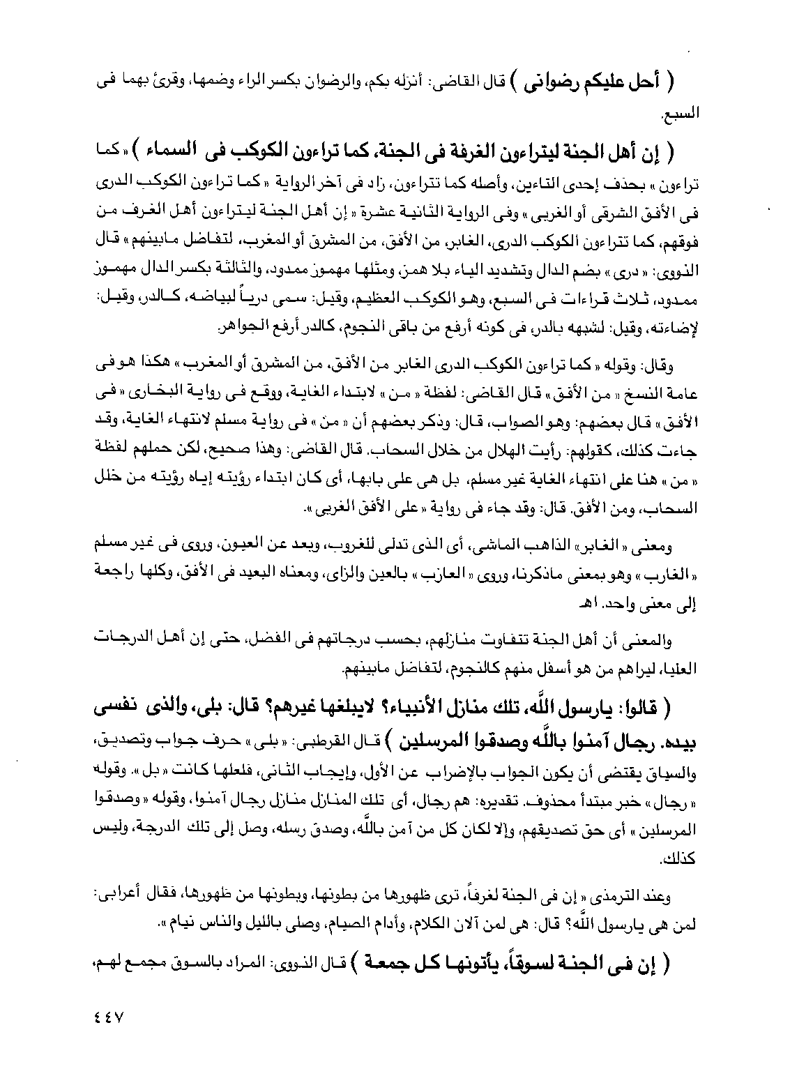 (إن أهل الجنة ليتراءون الغرفة في الجنة كما تراءون الكوكب في السماء) "كما تراءون" بحذف إحدى التاءين وأصله كما تتراءون زاد في آخر الرواية "كما تراءون الكوكب الدري في الأفق الشرقي أو الغربي" وفي الرواية الثانية عشرة "إن أهل الجنة ليتراءون أهل الغرف من فوقهم كما تتراءون الكوكب الدري الغابر من الأفق من المشرق أو المغرب لتفاضل ما بينهم" قال النووي "دري" بضم الدال وتشديد الياء بلا همز ومثلها مهموز ممدود والثالثة بكسر الدال مهموز ممدود ثلاث قراءات في السبع وهو الكوكب العظيم وقيل سمي دريا لبياضه كالدر وقيل لإضاءته وقيل لشبهه بالدر في كونه أرفع من باقي النجوم كالدر أرفع الجواهر