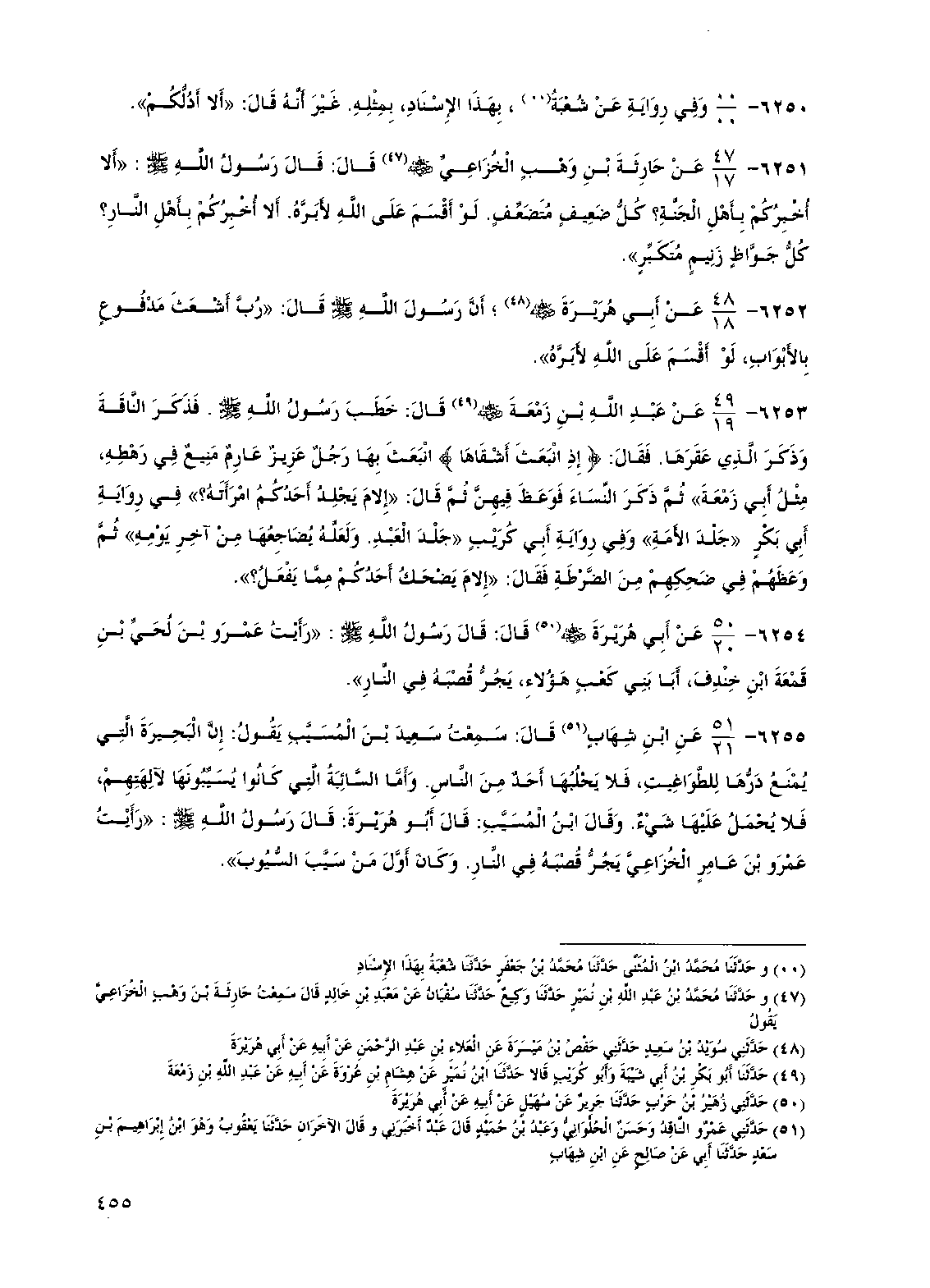6254 - عن أبي هريرة رضي الله عنه قال قال رسول الله صلى الله عليه وسلم "رأيت عمرو بن لحي بن قمعة بن خندف أبا بني كعب هؤلاء يجر قصبه في النار"