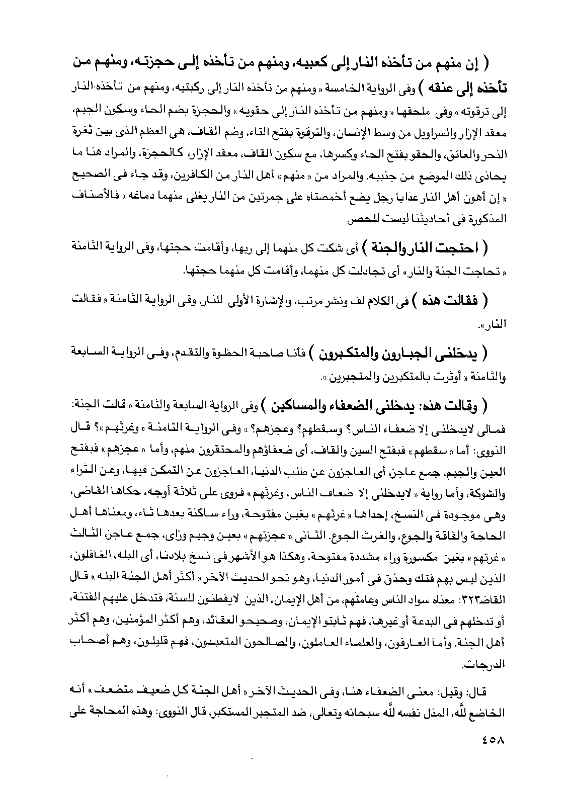(إن منهم من تأخذه النار إلى كعبيه ومنهم من تأخذه إلى حجزته ومنهم من تأخذه إلى عنقه) وفي الرواية الخامسة "ومنهم من تأخذه النار إلى ركبتيه ومنهم من تأخذه النار إلى ترقوته" وفي ملحقها "ومنهم من تأخذه النار إلى حقويه" والحجزة بضم الحاء وسكون الجيم معقد الإزار والسراويل من وسط الإنسان والترقوة بفتح التاء وضم القاف هي العظم الذي بين ثغرة النحر والعاتق والحقو بفتح الحاء وكسرها مع سكون القاف معقد الإزار كالحجزة والمراد هنا ما يحاذي ذلك الموضع من جنبيه والمراد من "منهم" أهل النار من الكافرين وقد جاء في الصحيح "إن أهون أهل النار عذابا رجل يضع أخمصتاه على جمرتين من النار يغلي منهما دماغه" فالأصناف المذكورة في أحاديثنا ليست للحصر