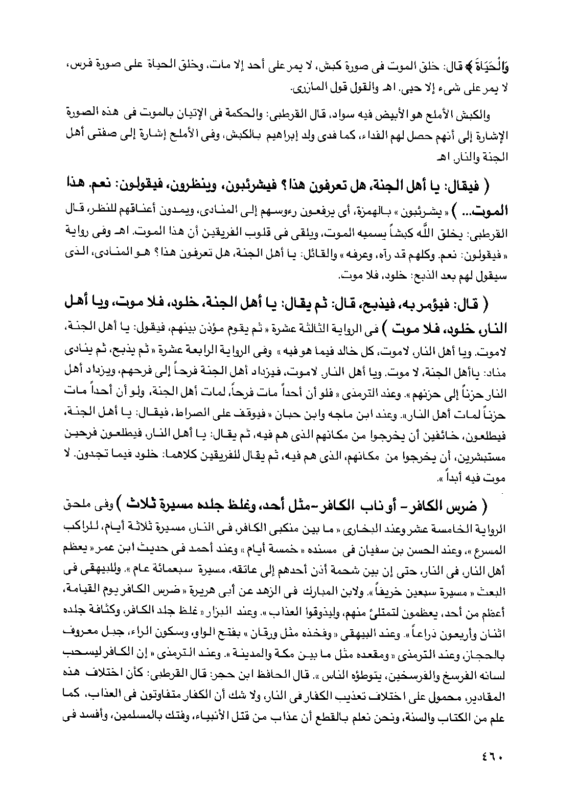 (فيقال يا أهل الجنة هل تعرفون هذا فيشرئبون وينظرون فيقولون نعم هذا الموت ... ) "يشرئبون" بالهمزة أي يرفعون رءوسهم إلى المنادي ويمدون أعناقهم للنظر قال القرطبي يخلق الله كبشا يسميه الموت ويلقي في قلوب الفريقين أن هذا الموت اهـ وفي رواية "فيقولون نعم وكلهم قد رآه وعرفه" والقائل يا أهل الجنة هل تعرفون هذا هو المنادي الذي سيقول لهم بعد الذبح خلود فلا موت