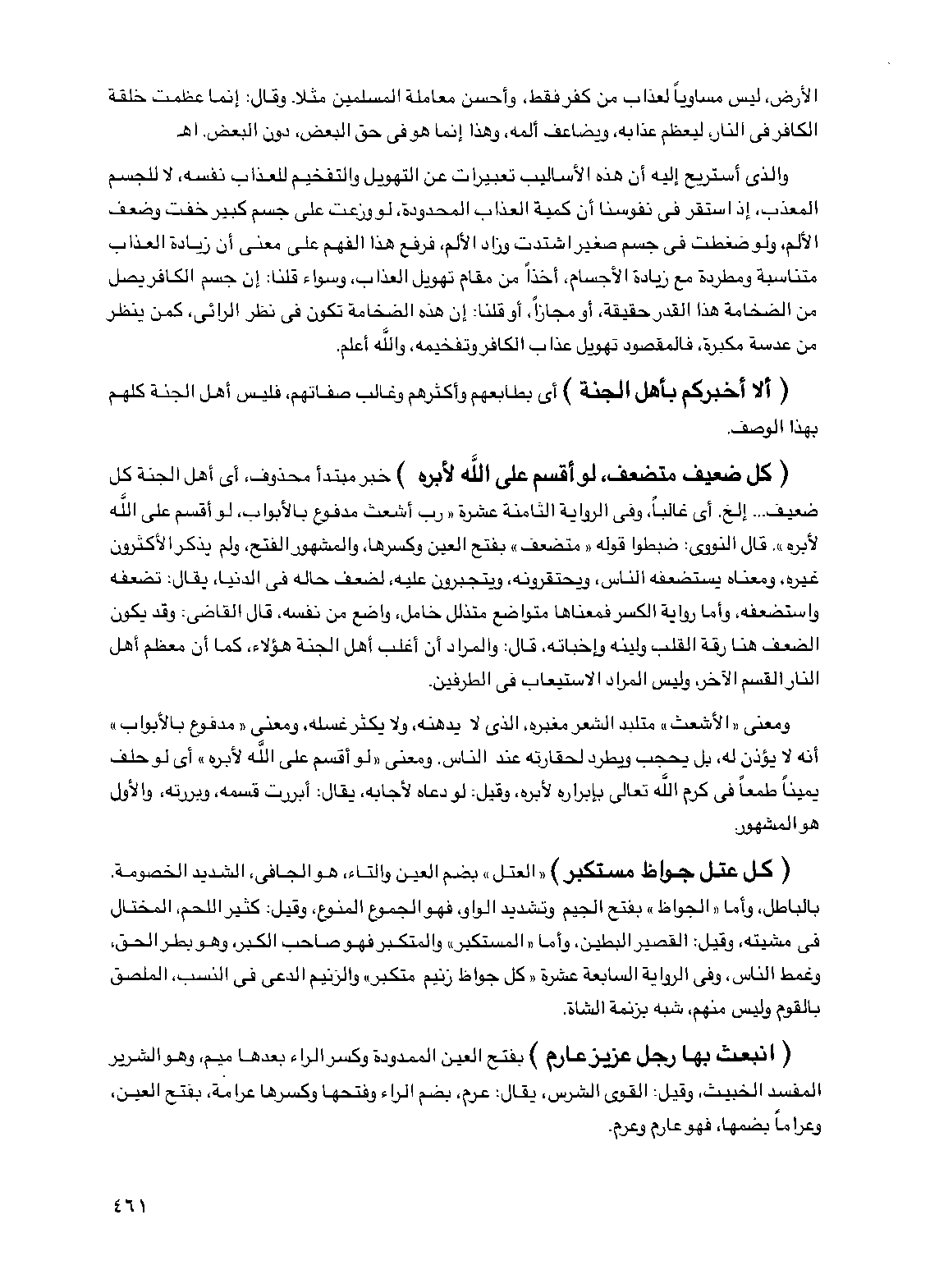 (كل عتل جواظ مستكبر) "العتل" بضم العين والتاء هو الجافي الشديد الخصومة بالباطل وأما "الجواظ" بفتح الجيم وتشديد الواو فهو الجموع المنوع وقيل كثير اللحم المختال في مشيته وقيل القصير البطين وأما "المستكبر" والمتكبر فهو صاحب الكبر وهو بطر الحق وغمط الناس وفي الرواية السابعة عشرة "كل جواظ زنيم متكبر" والزنيم الدعي في النسب الملصق بالقوم وليس منهم شبه بزنمة الشاة