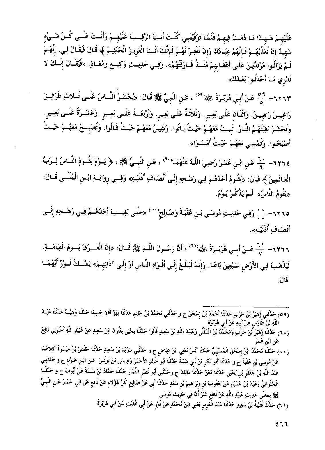 6264 - عن ابن عمر رضي الله عنهما عن النبي صلى الله عليه وسلم {يوم يقوم الناس لرب العالمين} قال "يقوم أحدهم في رشحه إلى أنصاف أذنيه" وفي رواية ابن المثنى قال "يقوم الناس" لم يذكر يوم.