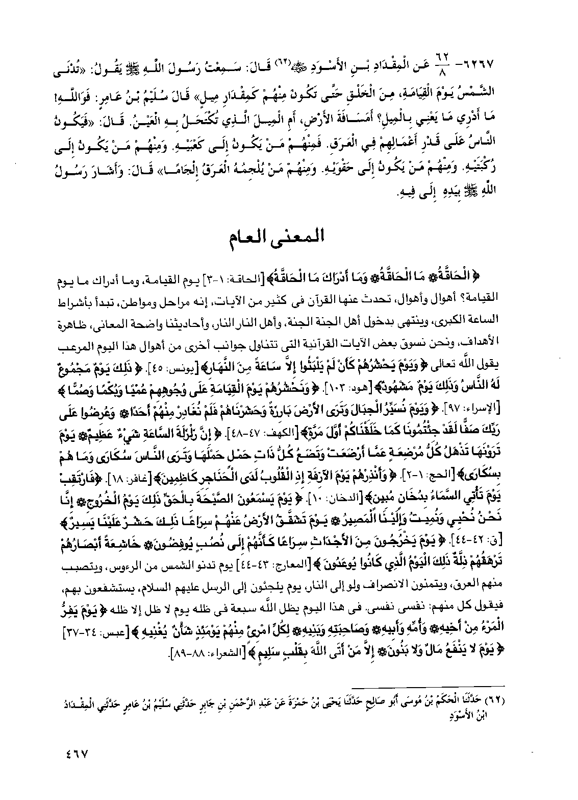 6267 - عن المقداد بن الأسود رضي الله عنه قال سمعت رسول الله صلى الله عليه وسلم يقول "تدنى الشمس يوم القيامة من الخلق حتى تكون منهم كمقدار ميل" قال سليم بن عامر فوالله ما أدري ما يعني بالميل أمسافة الأرض أم الميل الذي تكتحل به العين قال "فيكون الناس على قدر أعمالهم في العرق فمنهم من يكون إلى كعبيه ومنهم من يكون إلى ركبتيه ومنهم من يكون إلى حقويه ومنهم من يلجمه العرق إلجاما" قال وأشار رسول الله صلى الله عليه وسلم بيده إلى فيه