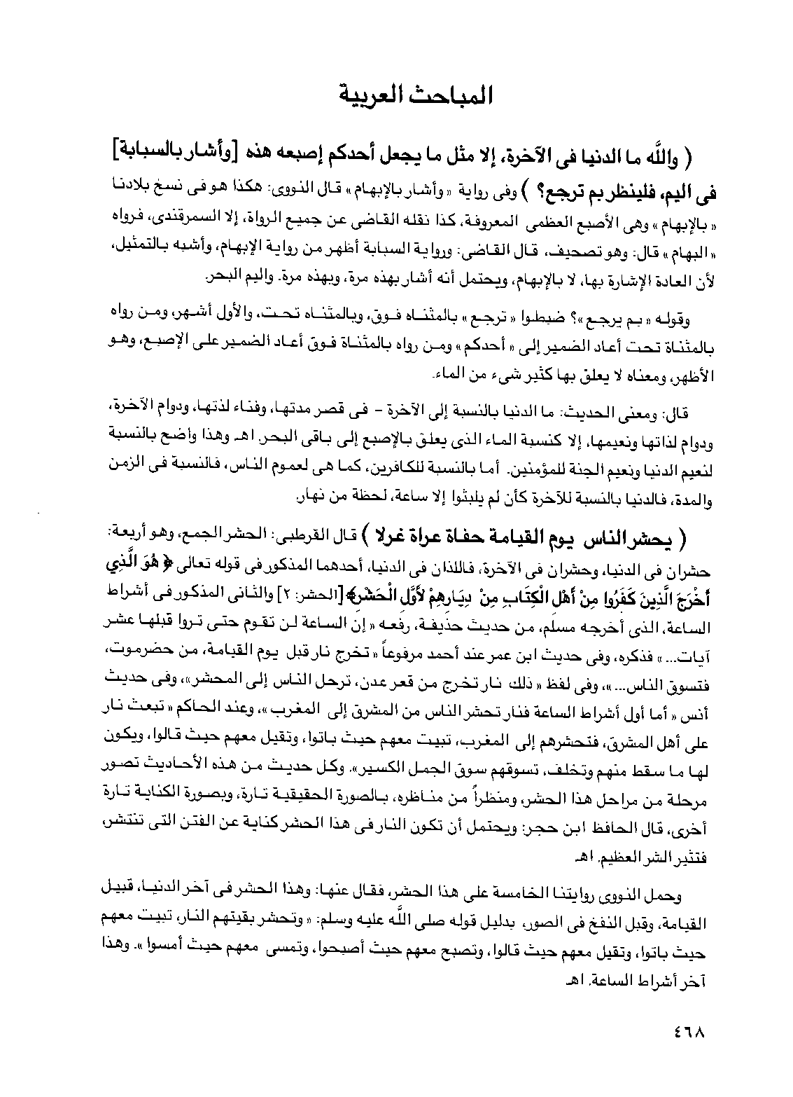 (والله ما الدنيا في الآخرة إلا مثل ما يجعل أحدكم إصبعه هذه [وأشار بالسبابة في اليم فلينظر بم ترجع) وفي رواية "وأشار بالإبهام" قال النووي هكذا هو في نسخ بلادنا "بالإبهام" وهي الأصبع العظمى المعروفة كذا نقله القاضي عن جميع الرواة إلا السمرقندي فرواه "البهام" قال وهو تصحيف قال القاضي ورواية السبابة أظهر من رواية الإبهام وأشبه بالتمثيل لأن العادة الإشارة بها لا بالإبهام ويحتمل أنه أشار بهذه مرة وبهذه مرة واليم البحر