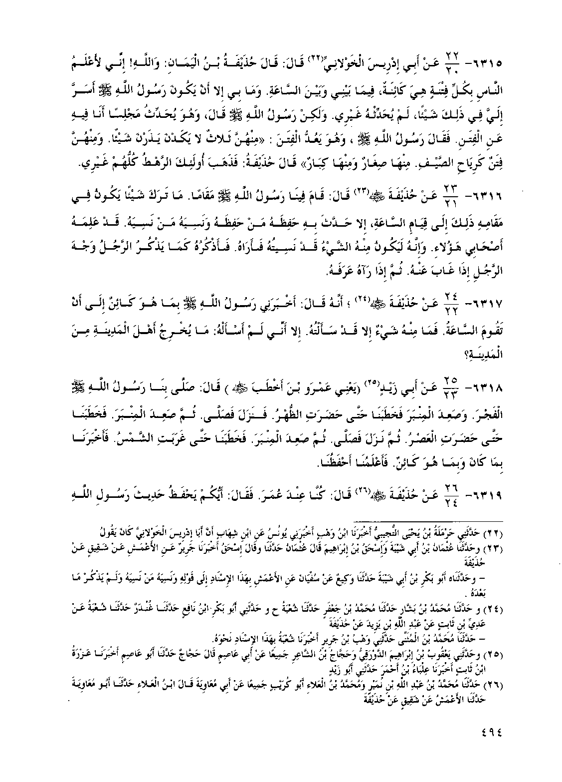 6315 - عن أبي إدريس الخولاني قال قال حذيفة بن اليمان والله إني لأعلم الناس بكل فتنة هي كائنة فيما بيني وبين الساعة وما بي إلا أن يكون رسول الله صلى الله عليه وسلم أسر إلي في ذلك شيئا لم يحدثه غيري ولكن رسول الله صلى الله عليه وسلم قال وهو يحدث مجلسا أنا فيه عن الفتن فقال رسول الله صلى الله عليه وسلم وهو يعد الفتن "منهن ثلاث لا يكدن يذرن شيئا ومنهن فتن كرياح الصيف منها صغار ومنها كبار" قال حذيفة فذهب أولئك الرهط كلهم غيري