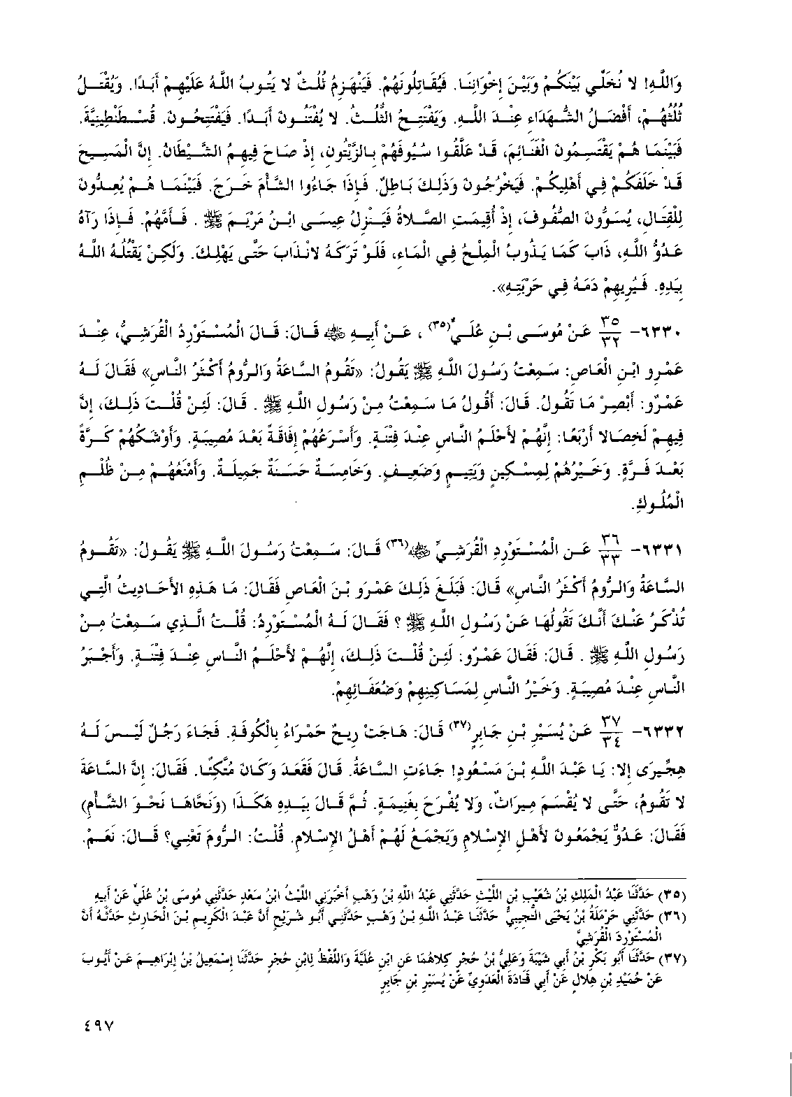 6331 - عن المستورد القرشي رضي الله عنه قال سمعت رسول الله صلى الله عليه وسلم يقول "تقوم الساعة والروم أكثر الناس" قال فبلغ ذلك عمرو بن العاص فقال ما هذه الأحاديث التي تذكر عنك أنك تقولها عن رسول الله صلى الله عليه وسلم فقال له المستورد قلت الذي سمعت من رسول الله صلى الله عليه وسلم قال فقال عمرو لئن قلت ذلك إنهم لأحلم الناس عند فتنة وأجبر الناس عند مصيبة وخير الناس لمساكينهم وضعفائهم