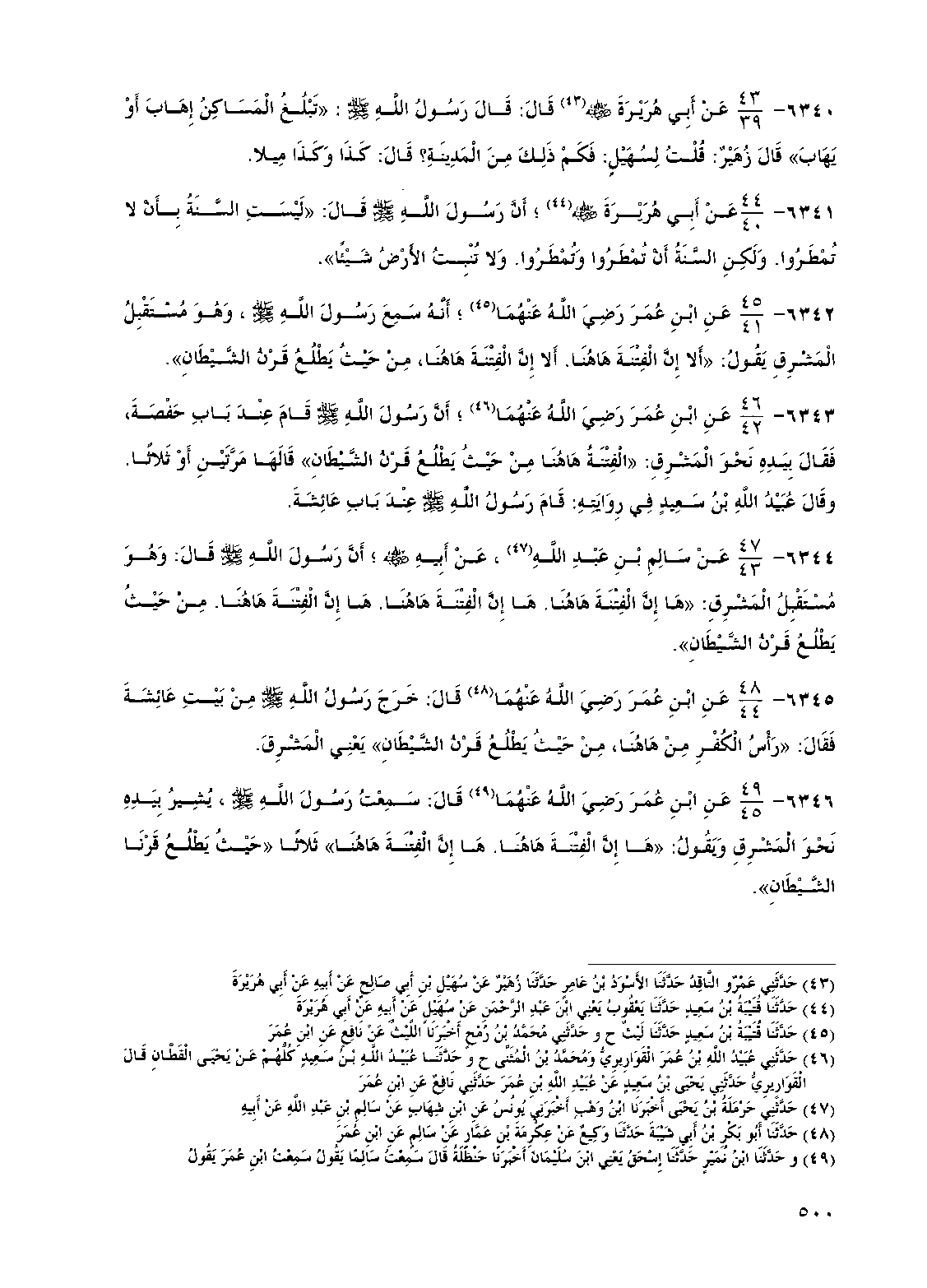 6344 - عن سالم بن عبد الله عن أبيه رضي الله عنه أن رسول الله صلى الله عليه وسلم قال وهو مستقبل المشرق "ها إن الفتنة ها هنا ها إن الفتنة ها هنا ها إن الفتنة ها هنا من حيث يطلع قرن الشيطان"