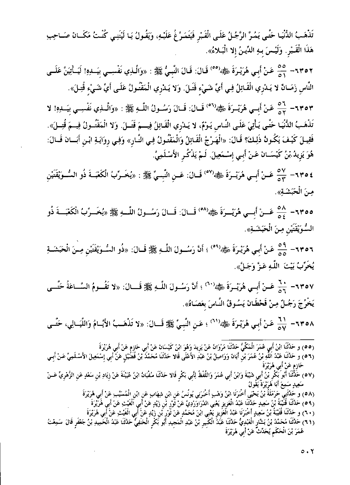 6354 - عن أبي هريرة رضي الله عنه قال عن النبي صلى الله عليه وسلم "يخرب الكعبة ذو السويقتين من الحبشة"