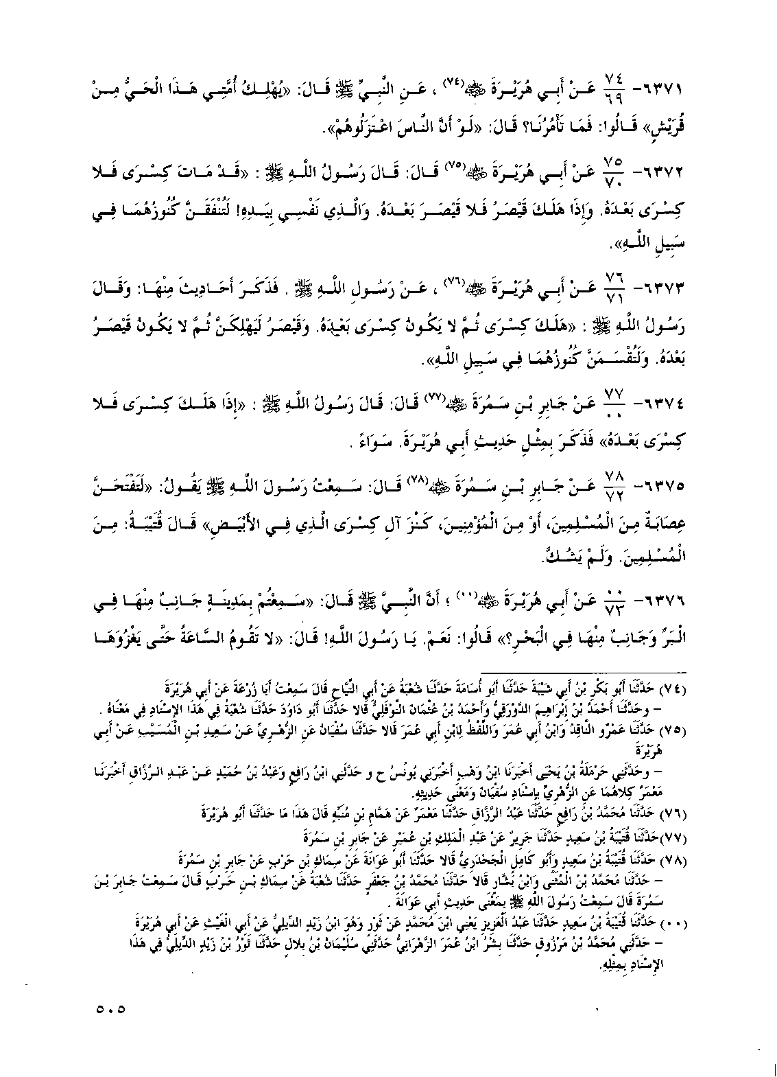 6372 - عن أبي هريرة رضي الله عنه قال قال رسول الله صلى الله عليه وسلم "قد مات كسرى فلا كسرى بعده وإذا هلك قيصر فلا قيصر بعده والذي نفسي بيده لتنفقن كنوزهما في سبيل الله"