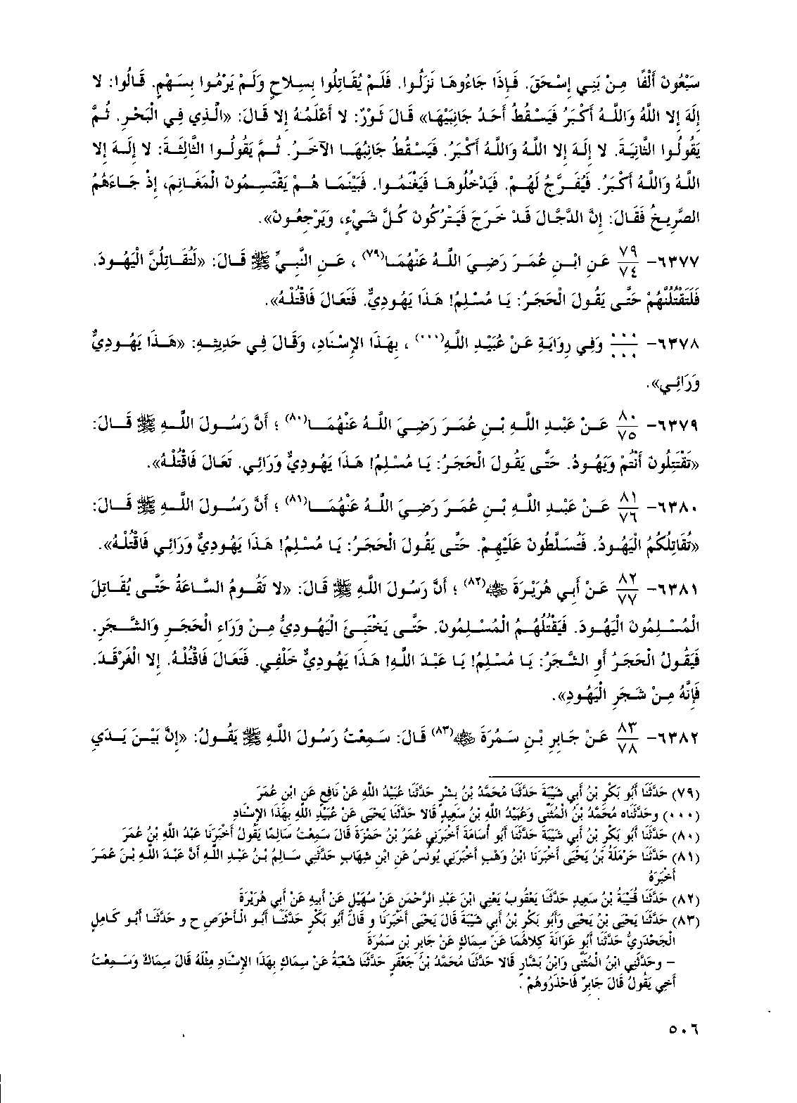 6377 - عن ابن عمر رضي الله عنهما عن النبي صلى الله عليه وسلم قال "لتقاتلن اليهود فلتقتلنهم حتى يقول الحجر يا مسلم هذا يهودي فتعال فاقتله"