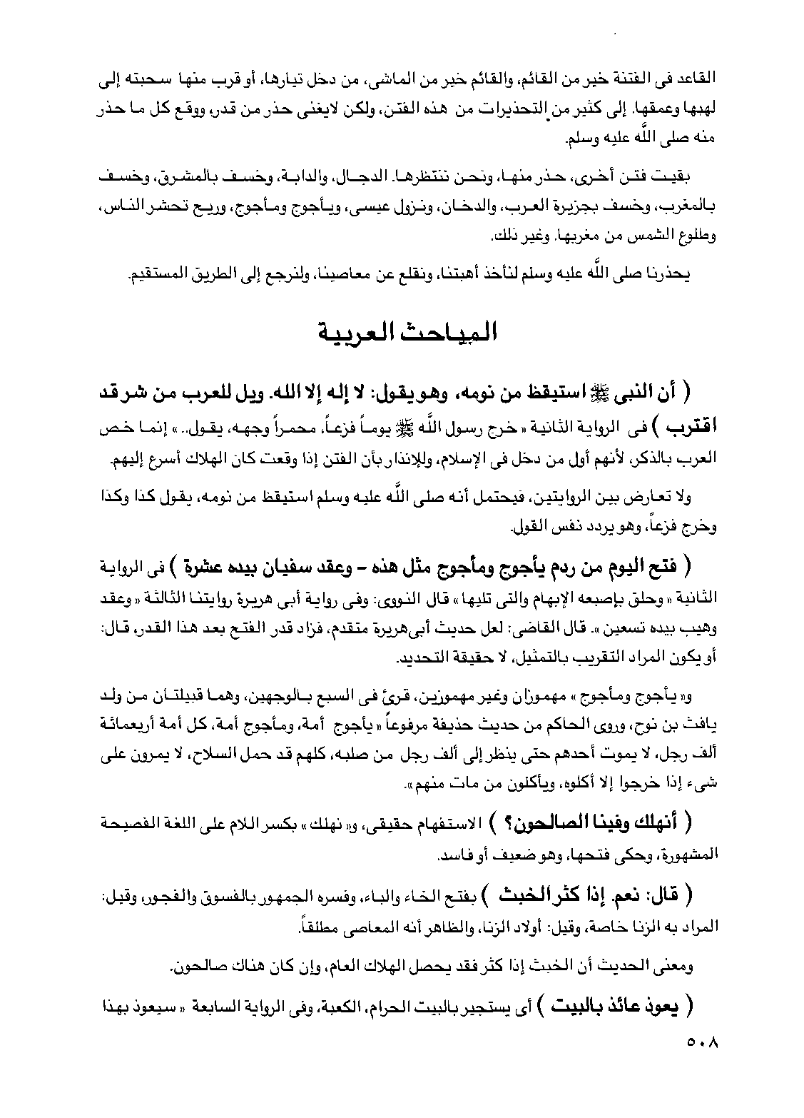 (أن النبي صلى الله عليه وسلم استيقظ من نومه وهو يقول لا إله إلا الله ويل للعرب من شر قد اقترب) في الرواية الثانية "خرج رسول الله صلى الله عليه وسلم يوما فزعا محمرا وجهه يقول .... " إنما خص العرب بالذكر لأنهم أول من دخل في الإسلام وللإنذار بأن الفتن إذا وقعت كان الهلاك أسرع إليهم