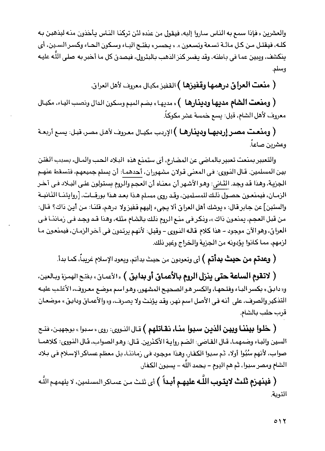 (لا تقوم الساعة حتى ينزل الروم بالأعماق أو بدابق) "الأعماق" بفتح الهمزة وبالعين و"دابق" بكسر الباء وفتحها والكسر هو الصحيح المشهور وهو اسم موضع معروف الأغلب عليه التذكير والصرف على أنه في الأصل اسم نهر وقد يؤنث ولا يصرف و"والأعماق ودابق" موضعان قرب حلب بالشام