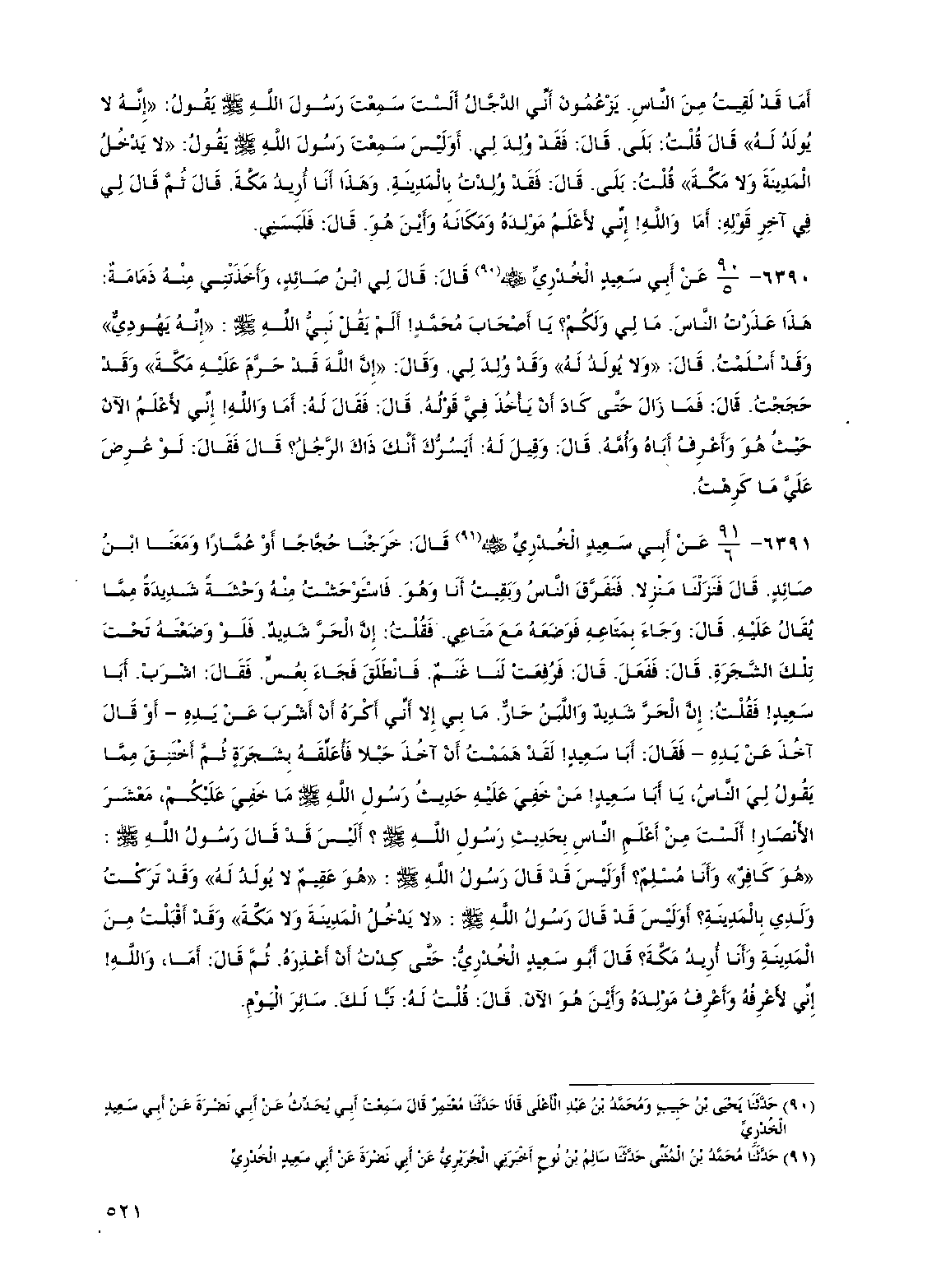 6391 - عن أبي سعيد الخدري رضي الله عنه قال خرجنا حجاجا أو عمارا ومعنا ابن صائد قال فنزلنا منزلا فتفرق الناس وبقيت أنا وهو فاستوحشت منه وحشة شديدة مما يقال عليه قال وجاء بمتاعه فوضعه مع متاعي فقلت إن الحر شديد فلو وضعته تحت تلك الشجرة قال ففعل قال فرفعت لنا غنم فانطلق فجاء بعس فقال اشرب أبا سعيد فقلت إن الحر شديد واللبن حار ما بي إلا أني أكره أن أشرب عن يده أو قال آخذ عن يده فقال أبا سعيد لقد هممت أن آخذ حبلا فأعلقه بشجرة ثم أختنق مما يقول لي الناس يا أبا سعيد من خفي عليه حديث رسول الله صلى الله عليه وسلم ما خفي عليكم معشر الأنصار ألست من أعلم الناس بحديث رسول الله صلى الله عليه وسلم أليس قد قال رسول الله صلى الله عليه وسلم "هو كافر" وأنا مسلم أوليس قد قال رسول الله صلى الله عليه وسلم "هو عقيم لا يولد له" وقد تركت ولدي بالمدينة أوليس قد قال رسول الله صلى الله عليه وسلم "لا يدخل المدينة ولا مكة" وقد أقبلت من المدينة وأنا أريد مكة قال أبو سعيد الخدري حتى كدت أن أعذره ثم قال أما والله إني لأعرفه وأعرف مولده وأين هو الآن قال قلت له تبا لك سائر اليوم