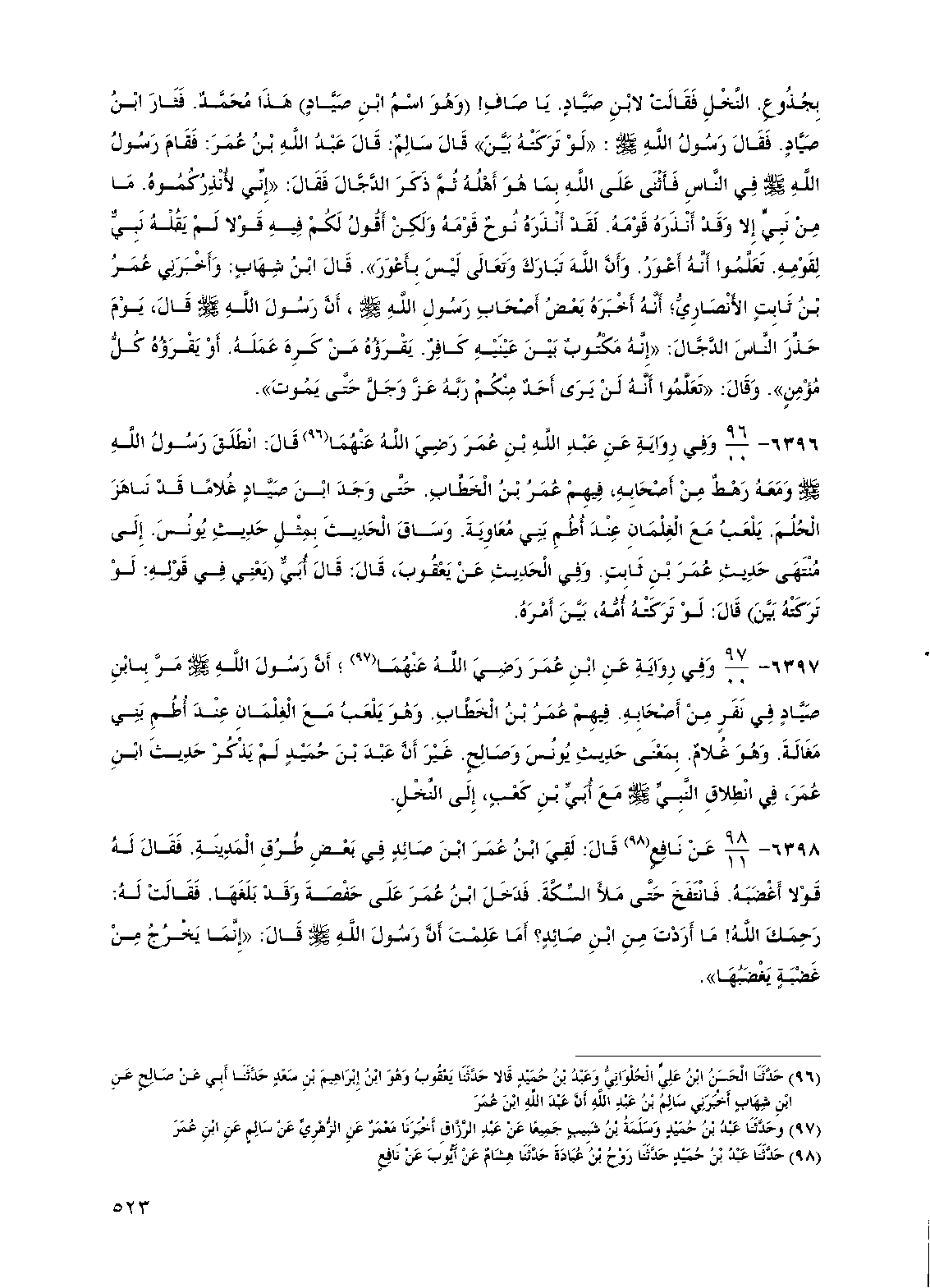 6397 - وفي رواية عن ابن عمر رضي الله عنهما أن رسول الله صلى الله عليه وسلم مر بابن صياد في نفر من أصحابه فيهم عمر بن الخطاب وهو يلعب مع الغلمان عند أطم بني مغالة وهو غلام بمعنى حديث يونس وصالح غير أن عبد بن حميد لم يذكر حديث ابن عمر في انطلاق النبي صلى الله عليه وسلم مع أبي بن كعب إلى النخل.