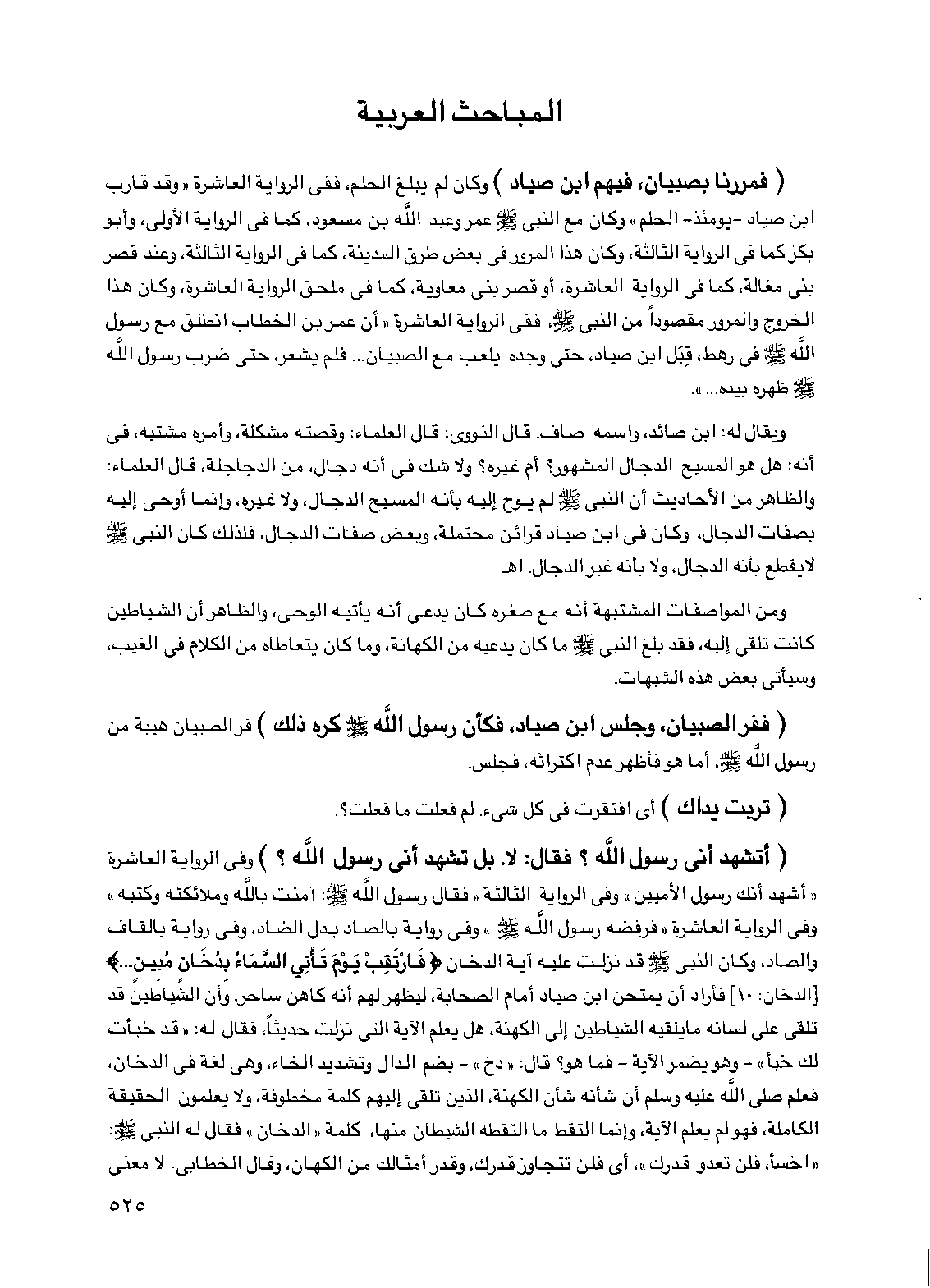 (أتشهد أني رسول الله فقال لا بل تشهد أني رسول الله) وفي الرواية العاشرة "أشهد أنك رسول الأميين" وفي الرواية الثالثة "فقال رسول الله صلى الله عليه وسلم آمنت بالله وملائكته وكتبه" وفي الرواية العاشرة "فرفضه رسول الله صلى الله عليه وسلم" وفي رواية بالصاد بدل الضاد وفي رواية بالقاف والصاد وكان النبي صلى الله عليه وسلم قد نزلت عليه آية الدخان {فارتقب يوم تأتي السماء بدخان مبين ... } [الدخان 10] فأراد أن يمتحن ابن صياد أمام الصحابة ليظهر لهم أنه كاهن ساحر وأن الشياطين قد تلقى على لسانه ما يلقيه الشياطين إلى الكهنة هل يعلم الآية التي نزلت حديثا فقال له "قد خبأت لك خبأ" وهو يضمر الآية فما هو قال "دخ" بضم الدال وتشديد الخاء وهي لغة في الدخان فعلم صلى الله عليه وسلم أن شأنه شأن الكهنة الذين تلقى إليهم كلمة مخطوفة ولا يعلمون الحقيقة الكاملة فهو لم يعلم الآية وإنما التقط ما التقطه الشيطان منها كلمة "الدخان" فقال له النبي صلى الله عليه وسلم "اخسأ فلن تعدو قدرك" أي فلن تتجاوز قدرك وقدر أمثالك من الكهان وقال الخطابي لا معنى